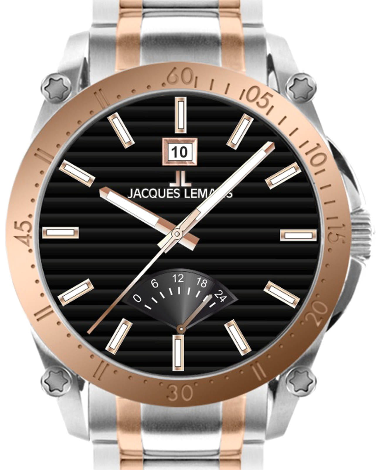 Мужские кварцевые часы Jacques Lemans 1-2202P – лаконичная красота и изысканная элегантность. Оригинальная модель с классическим оформлением станет превосходным завершением образа, наделив его индивидуальным характером. Корпус выполнен из нержавеющей стали, диаметром 44 мм, что обеспечивает долговечность и утончённый внешний вид. Минеральное стеклоМинеральное стеклоМинеральное стекло представляет собой искусственно выращенный минерал кварца. Такое стекло отличается особой устойчивостью к повреждениям и царапинам. Уступает по некоторым качествам сапфировому стеклу. с сапфировым напылением защищает циферблат от царапин. Стальной браслет с частичным PVD-покрытиемPVDУльтратонкое покрытие наносится в технике вакуумного напыления, сочетает в себе нитрид титана особой прочности со слоем золота или оксида хрома. Несёт в себе декоративную или защитную функцию. на раскладной застёжкеРаскладная застёжкаТакой тип застёжки используется только на браслетах из металла. Она никогда не раскрывается полностью, происходит разделение на 2 и более частей. Раскладывающая застёжка снизит вероятность потери часов к минимуму. обеспечивает комфортное ношение. На неподвижный безельБезельВнешний ободок, закрепляющий стекло. В спортивных часах так называется поворотное кольцо с делениями на циферблате, выполняет роль таймера – замеряет отрезки времени на шкале. Неподвижный безель – элемент декора. Однонаправленно вращающийся безель на дайверских часах позволяет фиксировать моменты погружения и выныривания на поверхность. с PVD-покрытиемPVDУльтратонкое покрытие наносится в технике вакуумного напыления, сочетает в себе нитрид титана особой прочности со слоем золота или оксида хрома. Несёт в себе декоративную или защитную функцию. нанесена минутная шкала. Водозащита 100 метров позволит плавать, нырять и заниматься другими водными видами спорта. Стрелки и метки с люминесцентным покрытиемЛюминесцентное покрытиеПозволяет считывать показания времени в темноте. Производители наносят на стрелки, часовые индексы, безель или поверхность циферблата светонакопительный состав, дающий холодное свечение. позволяющие легко определять время даже в темноте. Окошко даты находится в положении 12 часов. Индикатор 24-х часов вынесен на отдельный циферблат. Рифленая заводная головка с защитой. Это аксессуар для мужчины, который ценит классический стиль и функциональность.
