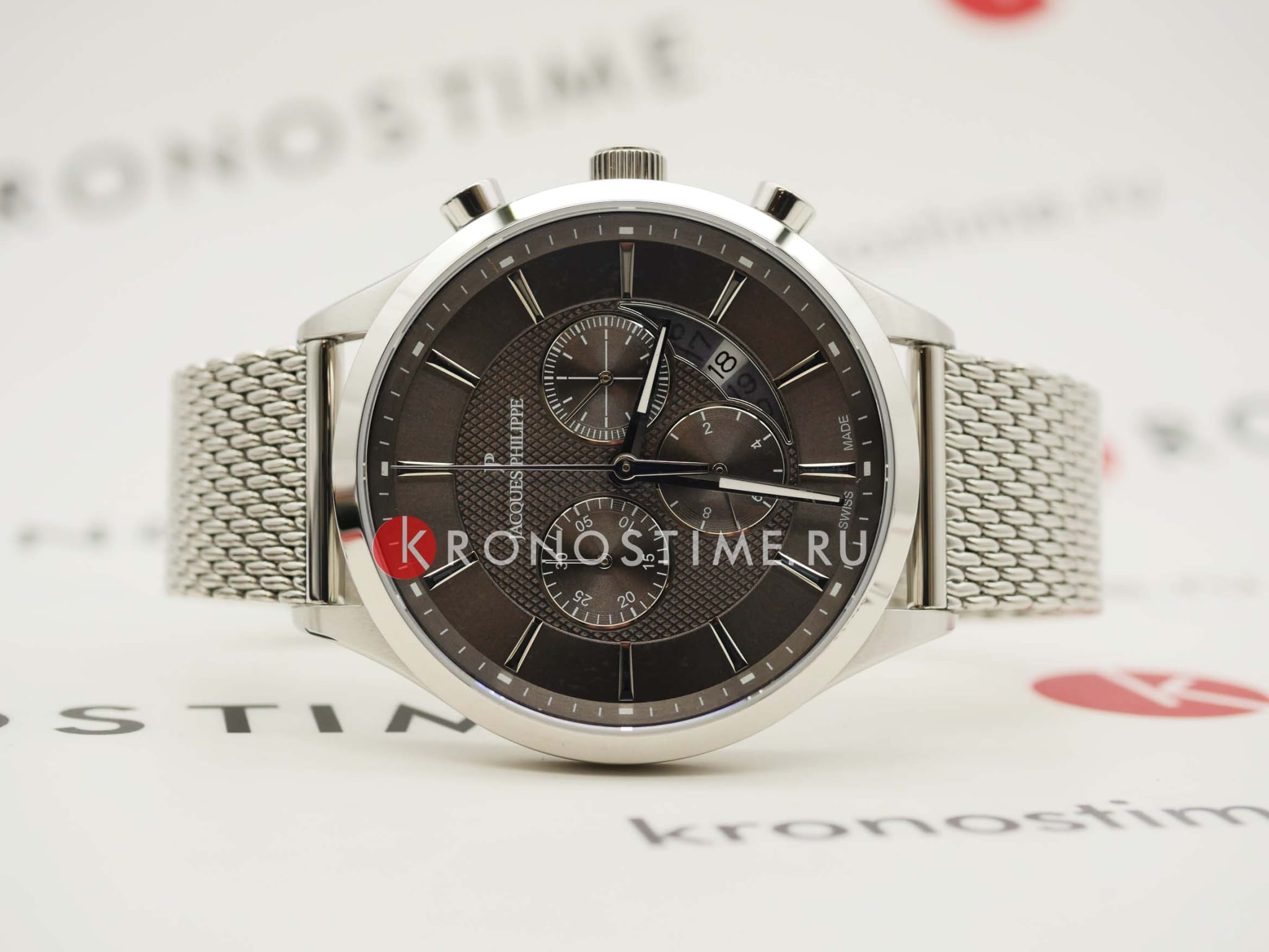 Швейцарские мужские часы-хронографХронографФункция позволяет измерять отрезки времени с особой точностью: часы, минуты, секунды. Верным признаком хронографа является наличие на циферблате 3 дополнительных окошек-счётчиков. Jacques Philippe Gallant JPQGC031216, кварцевый механизм с высокой точностью. Сапфировое стеклоСапфировое стеклоПрочный и надёжный материал из кристалла сапфира синтетического происхождения, характеризующийся особой твёрдостью и устойчивостью к царапинам и повреждениям. устойчивое к появлению царапин, обладающее высокой прозрачностью. Корпус часов изготовлен из нержавеющей стали. На циферблате три дополнительных индикатора. Стрелки с люминесцентным покрытиемЛюминесцентное покрытиеПозволяет считывать показания времени в темноте. Производители наносят на стрелки, часовые индексы, безель или поверхность циферблата светонакопительный состав, дающий холодное свечение.. Окошко даты находится между 4 и 5 часами. Класс водозащиты: 50 метров, позволит защитить корпус от случайных брызг или капель дождя. Стальной браслет миланского плетения на раскладном замкеРаскладной замокДанный вариант застежки используется только на часах с металлическим браслетом. Отличительная особенность такого крепления в том, что длина браслета становится универсальной и вы можете самостоятельно отрегулировать нужный вам размер – застежка просто двигается по браслету часов..