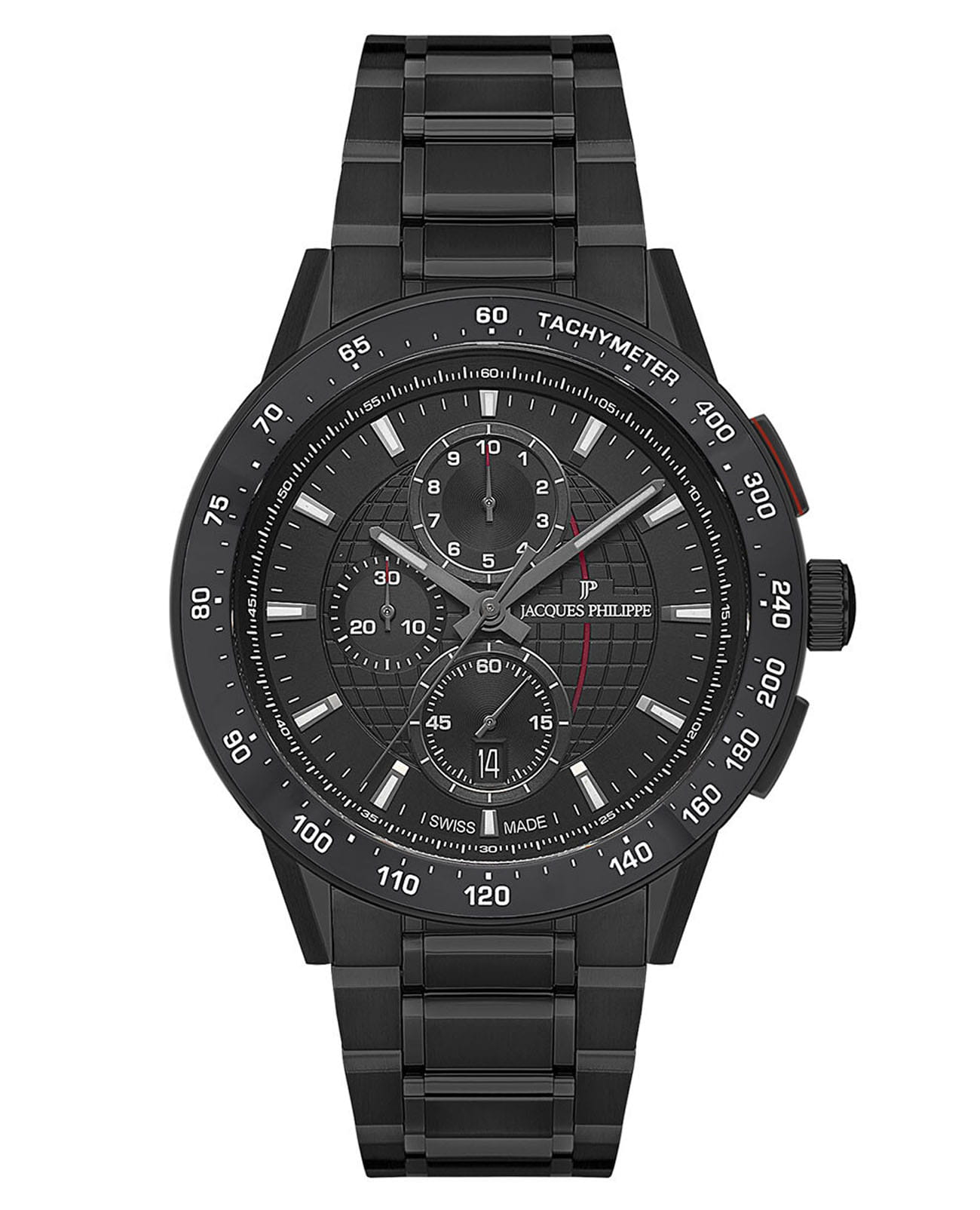 Швейцарские мужские часы-хронографХронографФункция позволяет измерять отрезки времени с особой точностью: часы, минуты, секунды. Верным признаком хронографа является наличие на циферблате 3 дополнительных окошек-счётчиков. с секундомеромСекундомерСекундоме́р — прибор, способный измерять интервалы времени с точностью до долей секунды. Jacques Philippe Globus JPQGC284311, кварцевый механизм с высокой точностью. Сапфировое стеклоСапфировое стеклоПрочный и надёжный материал из кристалла сапфира синтетического происхождения, характеризующийся особой твёрдостью и устойчивостью к царапинам и повреждениям. устойчивое к появлению царапин, обладающее высокой прозрачностью. Корпус часов изготовлен из нержавеющей стали с IP-покрытиемIP-покрытиеМетод ионного напыления. Демонстрирует повышенную устойчивость к истиранию, окислению и химическим веществам. Под воздействием высокого давления и температуры около 1500°C молекулы металла надёжно соединяются с частицами корпуса часов.. БезельБезельВнешний ободок, закрепляющий стекло. В спортивных часах так называется поворотное кольцо с делениями на циферблате, выполняет роль таймера – замеряет отрезки времени на шкале. Неподвижный безель – элемент декора. Однонаправленно вращающийся безель на дайверских часах позволяет фиксировать моменты погружения и выныривания на поверхность. с тахиметромТахиметрРазмеченная шкала, располагается на ободке или безеле часов. Тахиметр позволяет рассчитать скорость на определённом участке пути, расстояние измеряется в километрах или милях.. На циферблате три дополнительных индикатора. Окошко даты находится в положении 6 часов. Стрелки с люминесцентным покрытиемЛюминесцентное покрытиеПозволяет считывать показания времени в темноте. Производители наносят на стрелки, часовые индексы, безель или поверхность циферблата светонакопительный состав, дающий холодное свечение.. Класс водозащиты: 100 метров, позволит плавать, нырять и заниматься другими водными видами спорта. Стальной браслет с IP-покрытиемIP-покрытиеМетод ионного напыления. Демонстрирует повышенную устойчивость к истиранию, окислению и химическим веществам. Под воздействием высокого давления и температуры около 1500°C молекулы металла надёжно соединяются с частицами корпуса часов. на застёжке «бабочка» с кнопкамиЗастёжка "бабочка"Такой вид застёжки дополняется предохранителями, помогающими избежать случайного раскрытия браслета. Обладают изящным исполнением. .