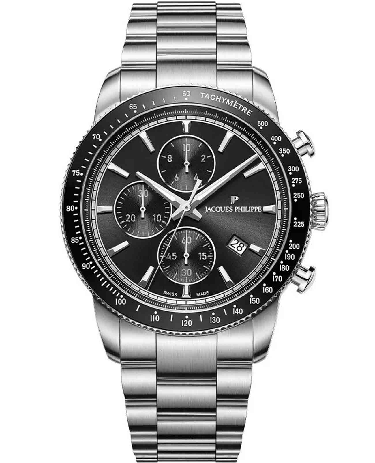 Швейцарские наручные часы Jacques Philippe JPQGC691316 сочетают в себе современный дизайн, надежность и функциональность, это стильные швейцарские часы с функцией хронографаХронографФункция позволяет измерять отрезки времени с особой точностью: часы, минуты, секунды. Верным признаком хронографа является наличие на циферблате 3 дополнительных окошек-счётчиков. и секундомераСекундомерСекундоме́р — прибор, способный измерять интервалы времени с точностью до долей секунды.. Корпус круглой формы диаметром 42 мм выполнен из прочной нержавеющей стали, а безельБезельВнешний ободок, закрепляющий стекло. В спортивных часах так называется поворотное кольцо с делениями на циферблате, выполняет роль таймера – замеряет отрезки времени на шкале. Неподвижный безель – элемент декора. Однонаправленно вращающийся безель на дайверских часах позволяет фиксировать моменты погружения и выныривания на поверхность. с элегантным черным IP-покрытиемIP-покрытиеМетод ионного напыления. Демонстрирует повышенную устойчивость к истиранию, окислению и химическим веществам. Под воздействием высокого давления и температуры около 1500°C молекулы металла надёжно соединяются с частицами корпуса часов.. Сапфировое стеклоСапфировое стеклоПрочный и надёжный материал из кристалла сапфира синтетического происхождения, характеризующийся особой твёрдостью и устойчивостью к царапинам и повреждениям. с антибликовым покрытиемАнтибликовое покрытиеСлой оксида металла в 0,13-0,3 микрон, благодаря которому стекло часов не бликует и не отражает свет. Антибликовое покрытие уменьшает отражение света в 10 раз, обеспечивая отличную читаемость показателей циферблата. надежно защищает черный циферблат от царапин и повреждений. Модель оснащена точным кварцевым механизмом, а также дополнительными функциями — тахиметромТахиметрРазмеченная шкала, располагается на ободке или безеле часов. Тахиметр позволяет рассчитать скорость на определённом участке пути, расстояние измеряется в километрах или милях. и индикатором даты, что делает часы не только стильным аксессуаром, но и практичным помощником на каждый день. Серебряный браслет шириной 22 мм удобно фиксируется на запястье с помощью застежки «бабочка»Застёжка "бабочка"Такой вид застёжки дополняется предохранителями, помогающими избежать случайного раскрытия браслета. Обладают изящным исполнением. . Стрелки имеют люминесцентное покрытиеЛюминесцентное покрытиеПозволяет считывать показания времени в темноте. Производители наносят на стрелки, часовые индексы, безель или поверхность циферблата светонакопительный состав, дающий холодное свечение. для удобства чтения времени в темноте. Водозащита 5 АТМ позволяет не снимать часы при дожде и случайных контактах с водой.
