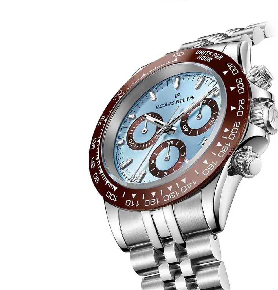 Швейцарские наручные часы Jacques Philippe JPQGC7113X6SBBR сочетают в себе современный дизайн, надежность и функциональность, это стильные швейцарские часы с функцией хронографаХронографФункция позволяет измерять отрезки времени с особой точностью: часы, минуты, секунды. Верным признаком хронографа является наличие на циферблате 3 дополнительных окошек-счётчиков. и секундомераСекундомерСекундоме́р — прибор, способный измерять интервалы времени с точностью до долей секунды.. Корпус круглой формы диаметром 39 мм выполнен из прочной нержавеющей стали, а безельБезельВнешний ободок, закрепляющий стекло. В спортивных часах так называется поворотное кольцо с делениями на циферблате, выполняет роль таймера – замеряет отрезки времени на шкале. Неподвижный безель – элемент декора. Однонаправленно вращающийся безель на дайверских часах позволяет фиксировать моменты погружения и выныривания на поверхность. с элегантным коричневым IP-покрытиемIP-покрытиеМетод ионного напыления. Демонстрирует повышенную устойчивость к истиранию, окислению и химическим веществам. Под воздействием высокого давления и температуры около 1500°C молекулы металла надёжно соединяются с частицами корпуса часов., а сапфировое стеклоСапфировое стеклоПрочный и надёжный материал из кристалла сапфира синтетического происхождения, характеризующийся особой твёрдостью и устойчивостью к царапинам и повреждениям. надежно защищает голубой циферблат от царапин и повреждений. Модель оснащена точным кварцевым механизмом RONDA 5030.D-4H, а также дополнительными функциями — тахиметромТахиметрРазмеченная шкала, располагается на ободке или безеле часов. Тахиметр позволяет рассчитать скорость на определённом участке пути, расстояние измеряется в километрах или милях. и индикатором даты, что делает часы не только стильным аксессуаром, но и практичным помощником на каждый день. Серебристый браслет шириной 20 мм удобно фиксируется на запястье с помощью застежки «бабочка»Застёжка "бабочка"Такой вид застёжки дополняется предохранителями, помогающими избежать случайного раскрытия браслета. Обладают изящным исполнением. . Стрелки имеют люминесцентное покрытиеЛюминесцентное покрытиеПозволяет считывать показания времени в темноте. Производители наносят на стрелки, часовые индексы, безель или поверхность циферблата светонакопительный состав, дающий холодное свечение. для удобства чтения времени в темноте. Водозащита 5 АТМ позволяет не снимать часы при дожде и случайных контактах с водой.