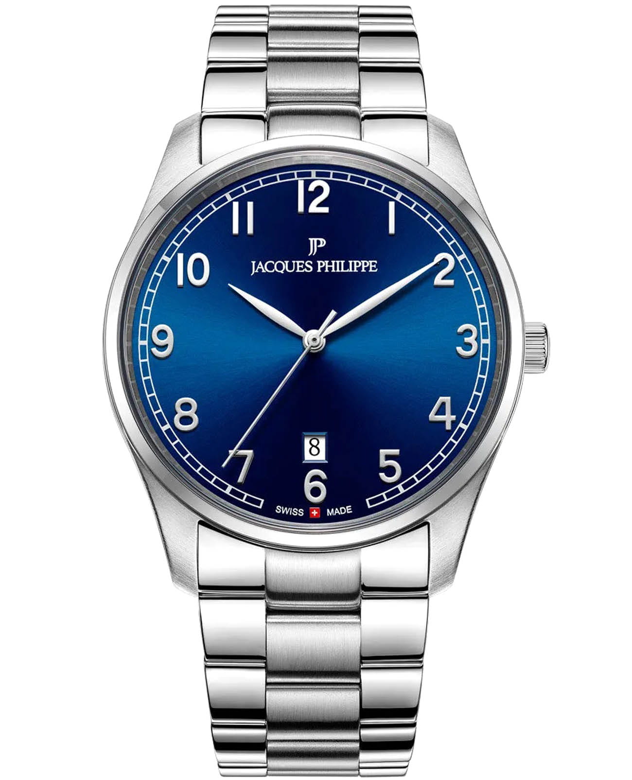Швейцарские мужские часы Jacques Philippe Maturus JPQGS881336 кварцевый механизм с высокой точностью. Прочное сапфировое стеклоСапфировое стеклоПрочный и надёжный материал из кристалла сапфира синтетического происхождения, характеризующийся особой твёрдостью и устойчивостью к царапинам и повреждениям. устойчивое к царапинам и механическим повреждениям. Циферблат синего цвета украшен классическими стрелками и метками гармонично дополняющие общий дизайн модели. Элегантный корпус изготовлен из нержавеющей стали, диаметром 41 мм, что делает их устойчивыми к внешним воздействиям и придает благородный вид. Стальной браслет на застёжке-бабочкеЗастёжка "бабочка"Такой вид застёжки дополняется предохранителями, помогающими избежать случайного раскрытия браслета. Обладают изящным исполнением. обеспечивает комфортное и безопасное ношение. Окошко даты находится в положении 6 часов. Класс водозащиты: 50 метров позволит защитить корпус от случайных брызг или капель дождя. Эти часы станут идеальным выбором для мужчин, ценящих стиль, качество и функциональность.