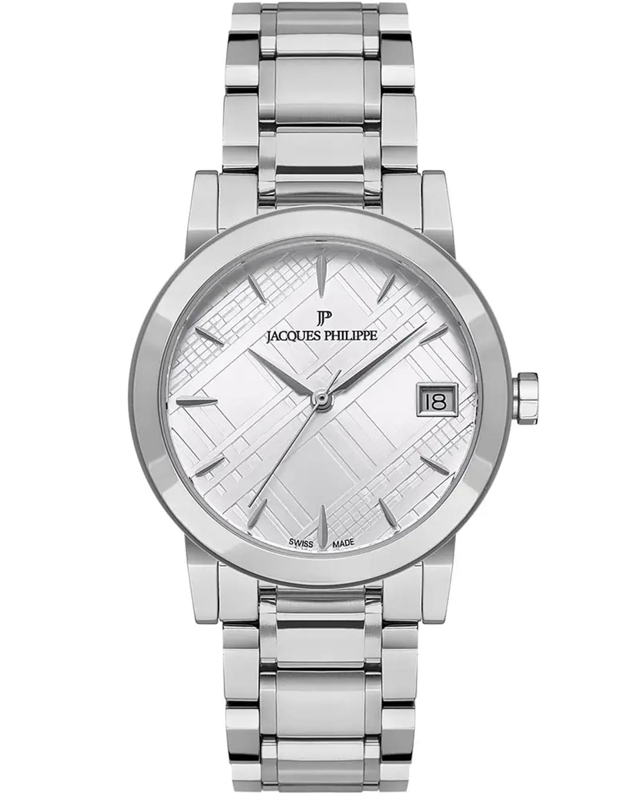 Швейцарские женские часы Jacques Philippe Principle JPQLS161326, кварцевый механизм с высокой точностью. Сапфировое стеклоСапфировое стеклоПрочный и надёжный материал из кристалла сапфира синтетического происхождения, характеризующийся особой твёрдостью и устойчивостью к царапинам и повреждениям. устойчивое к появлению царапин, обладающее высокой прозрачностью. Корпус и браслет часов изготовлены из нержавеющей стали. Класс водозащиты: 50 метров, позволит защитить корпус от случайных брызг или капель дождя. Стальной браслет на застёжке-бабочке с кнопкамиЗастёжка "бабочка"Такой вид застёжки дополняется предохранителями, помогающими избежать случайного раскрытия браслета. Обладают изящным исполнением. . Окошко даты находится в положении 3 часа.