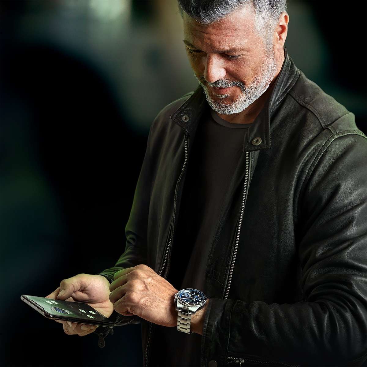 Мужские швейцарские часы Jaguar Connected J888/6. Сапфировое стеклоСапфировое стеклоПрочный и надёжный материал из кристалла сапфира синтетического происхождения, характеризующийся особой твёрдостью и устойчивостью к царапинам и повреждениям. устойчивое к мелким механическим повреждениям. Корпус и браслет часов изготовлены из нержавеющей стали. Стрелки и метки с люминесцентным покрытиемЛюминесцентное покрытиеПозволяет считывать показания времени в темноте. Производители наносят на стрелки, часовые индексы, безель или поверхность циферблата светонакопительный состав, дающий холодное свечение.. Календарь находится в положении 8 часов. Класс водозащиты: 200 метров, позволит плавать, нырять и заниматься другими водными видами спорта. Стальной браслет на раскладной застёжкеРаскладная застёжкаТакой тип застёжки используется только на браслетах из металла. Она никогда не раскрывается полностью, происходит разделение на 2 и более частей. Раскладывающая застёжка снизит вероятность потери часов к минимуму.. БезельБезельВнешний ободок, закрепляющий стекло. В спортивных часах так называется поворотное кольцо с делениями на циферблате, выполняет роль таймера – замеряет отрезки времени на шкале. Неподвижный безель – элемент декора. Однонаправленно вращающийся безель на дайверских часах позволяет фиксировать моменты погружения и выныривания на поверхность. с PVD-покрытиемPVDУльтратонкое покрытие наносится в технике вакуумного напыления, сочетает в себе нитрид титана особой прочности со слоем золота или оксида хрома. Несёт в себе декоративную или защитную функцию.. За точный ход работы часов, из коллекции Connected, отвечает кварцевый гибридный механизм швейцарского производства со Смарт-Модулем. Данный тип механизма обеспечивает возможность подключить часы к телефону через Bluetooth и управлять большим рядом дополнительных функций на выбор с помошью приложения Jaguar. Дополнительные функции: отображение даты и дня недели, секундомер, таймер, GMT, шагомер, поиск телефона, включение/выключение звука телефона при входящих вызовах, переключение музыки, вибро-уведомления.