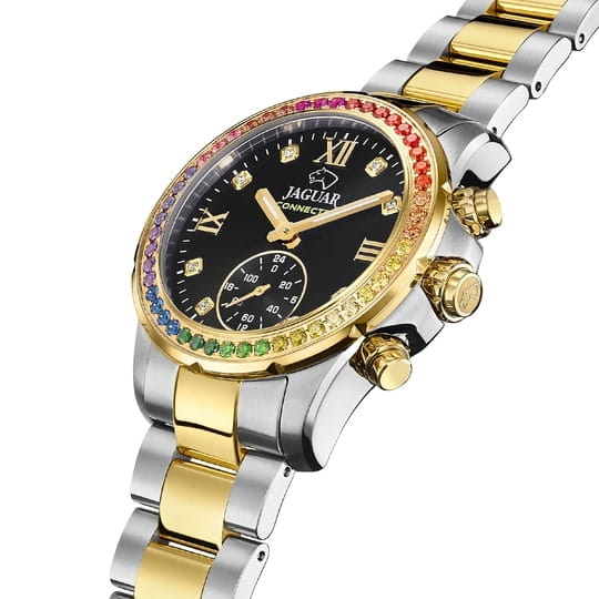 Женские швейцарские часы Jaguar Connected Lady J982/5. Сапфировое стеклоСапфировое стеклоПрочный и надёжный материал из кристалла сапфира синтетического происхождения, характеризующийся особой твёрдостью и устойчивостью к царапинам и повреждениям. устойчивое к мелким механическим повреждениям. Корпус часов изготовлен из нержавеющей стали. Стрелки с люминесцентным покрытиемЛюминесцентное покрытиеПозволяет считывать показания времени в темноте. Производители наносят на стрелки, часовые индексы, безель или поверхность циферблата светонакопительный состав, дающий холодное свечение.. Класс водозащиты: 50 метров, позволит защитить корпус от случайных брызг или капель дождя. БезельБезельВнешний ободок, закрепляющий стекло. В спортивных часах так называется поворотное кольцо с делениями на циферблате, выполняет роль таймера – замеряет отрезки времени на шкале. Неподвижный безель – элемент декора. Однонаправленно вращающийся безель на дайверских часах позволяет фиксировать моменты погружения и выныривания на поверхность. с PVD-покрытиемPVDУльтратонкое покрытие наносится в технике вакуумного напыления, сочетает в себе нитрид титана особой прочности со слоем золота или оксида хрома. Несёт в себе декоративную или защитную функцию. и циферблат инкрустированы цирконием. Стальной браслет с частичным PVD-покрытиемPVDУльтратонкое покрытие наносится в технике вакуумного напыления, сочетает в себе нитрид титана особой прочности со слоем золота или оксида хрома. Несёт в себе декоративную или защитную функцию. на раскладной застёжкеРаскладная застёжкаТакой тип застёжки используется только на браслетах из металла. Она никогда не раскрывается полностью, происходит разделение на 2 и более частей. Раскладывающая застёжка снизит вероятность потери часов к минимуму.. За точный ход работы часов, из коллекции Connected, отвечает кварцевый гибридный механизм швейцарского производства со Смарт-Модулем. Данный тип механизма обеспечивает возможность подключить часы к телефону через Bluetooth и управлять большим рядом дополнительных функций на выбор с помошью приложения Jaguar. Дополнительные функции: отображение даты и дня недели, секундомер, таймер, GMT, шагомер, поиск телефона, включение/выключение звука телефона при входящих вызовах, переключение музыки, вибро-уведомления.