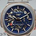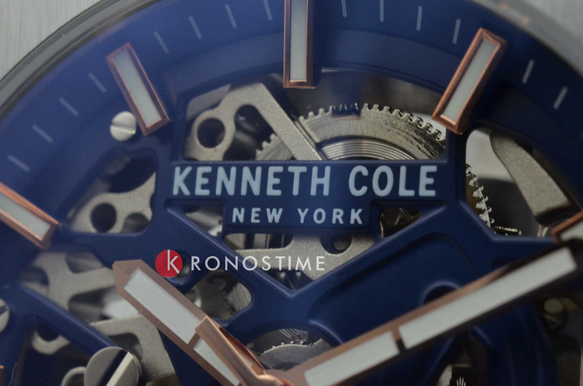 Мужские механические часы с автоподзаводом Kenneth Cole KCWGY0046201 — это выразительный аксессуар, сочетающий современный дизайн и инженерную изысканность. Корпус размером 44 мм выполнен из нержавеющей стали. Безель с частичным IP-покрытиемIP-покрытиеМетод ионного напыления. Демонстрирует повышенную устойчивость к истиранию, окислению и химическим веществам. Под воздействием высокого давления и температуры около 1500°C молекулы металла надёжно соединяются с частицами корпуса часов. розового золота и стального цвета. Циферблат синего цвета частично скелетонизирован, что позволяет наблюдать за работой механизма, добавляя модели динамики и технологичности. Циферблат защищён минеральным стекломМинеральное стеклоМинеральное стекло представляет собой искусственно выращенный минерал кварца. Такое стекло отличается особой устойчивостью к повреждениям и царапинам. Уступает по некоторым качествам сапфировому стеклу. и оформлен метками в виде штрихов. Стрелки и метки оснащены люминесцентным покрытиемЛюминесцентное покрытиеПозволяет считывать показания времени в темноте. Производители наносят на стрелки, часовые индексы, безель или поверхность циферблата светонакопительный состав, дающий холодное свечение., обеспечивающим хорошую читаемость в темноте. Часы оснащены стальным браслетом с раскладной застёжкойРаскладная застёжкаТакой тип застёжки используется только на браслетах из металла. Она никогда не раскрывается полностью, происходит разделение на 2 и более частей. Раскладывающая застёжка снизит вероятность потери часов к минимуму.. Водонепроницаемость 30 м позволяет использовать часы в повседневных условиях, защищая от случайных брызг и капель дождя. Сочетание строгого стиля и детального исполнения делает эти часы заметным элементом образа.