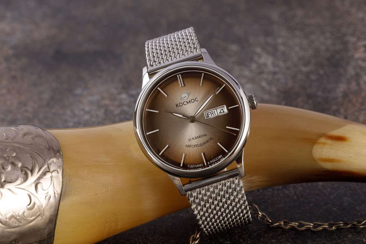 Российские мужские механические часы Космос K 043.10.30 с автоподзаводом оснащены корпусом из нержавеющей стали 316L диаметром 41 мм и защищены минеральным стекломМинеральное стеклоМинеральное стекло представляет собой искусственно выращенный минерал кварца. Такое стекло отличается особой устойчивостью к повреждениям и царапинам. Уступает по некоторым качествам сапфировому стеклу.. Циферблат песочного цвета с коричневыми и золотыми элементами дополнен функциями отображения даты и дня недели. Заводная головка декорирована логотипом бренда в виде стилизованного изображения планеты. Часы имеют водонепроницаемость 50 метров, позволит защитить корпус от случайных брызг или капель дождя. Модель комплектуется браслетом из нержавеющей стали 316L с миланским плетением на раскладном замкеРаскладной замокДанный вариант застежки используется только на часах с металлическим браслетом. Отличительная особенность такого крепления в том, что длина браслета становится универсальной и вы можете самостоятельно отрегулировать нужный вам размер – застежка просто двигается по браслету часов.. Специальные крепежи позволяют легко заменить браслет на часах самостоятельно. Прочный корпус и надежный механизм делают эти часы универсальным аксессуаром для повседневного использования. Уникальный дизайн и высокое качество материалов подчеркивают индивидуальность владельца.