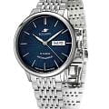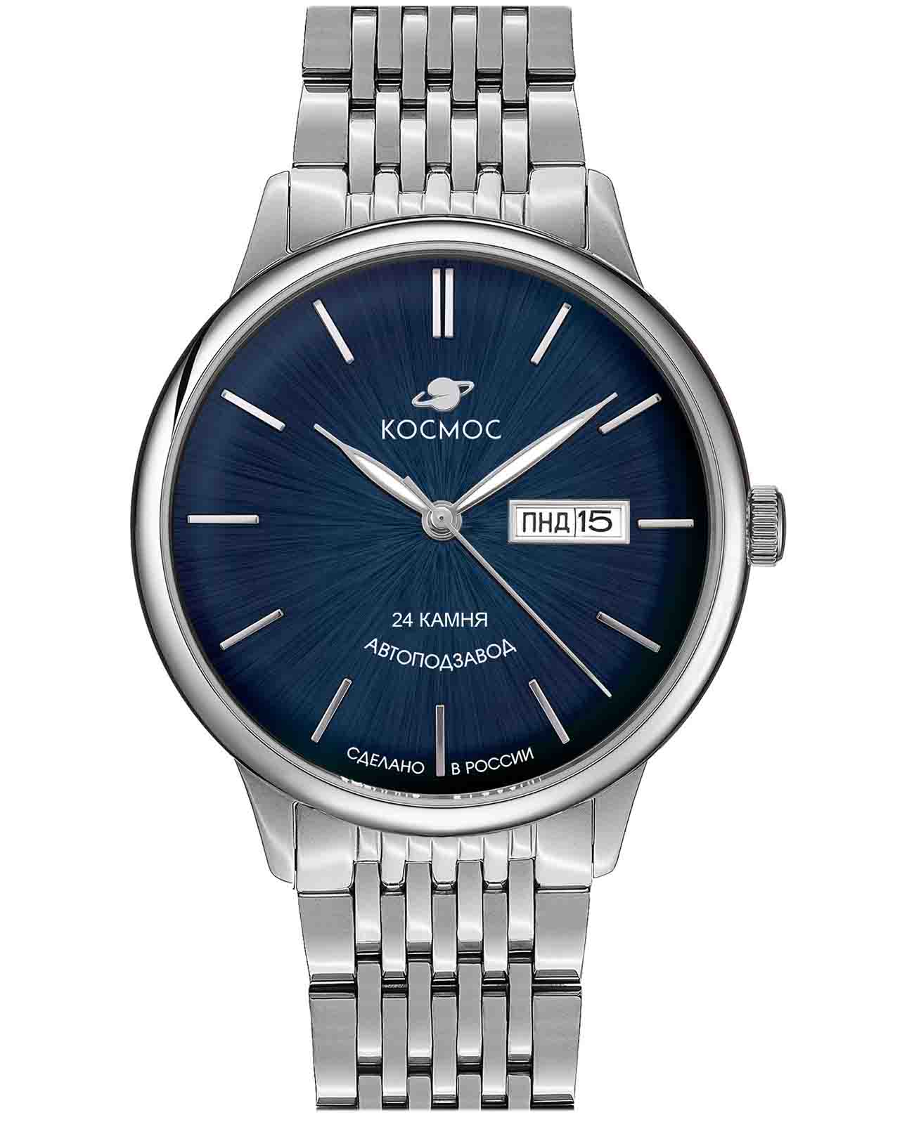 Российские мужские механические часы Космос из коллекции Юпитер оснащены механизмом TMI с автоподзаводом. Круглый корпус из нержавеющей стали диаметром 41 мм защищен минеральным стекломМинеральное стеклоМинеральное стекло представляет собой искусственно выращенный минерал кварца. Такое стекло отличается особой устойчивостью к повреждениям и царапинам. Уступает по некоторым качествам сапфировому стеклу.. Циферблат дополнен функциями отображения даты и дня недели. Часы имеют водонепроницаемость 50 метров, позволит защитить корпус от случайных брызг или капель дождя. Модель комплектуется стальным браслетом на застёжке-бабочке с кнопкамиЗастёжка "бабочка"Такой вид застёжки дополняется предохранителями, помогающими избежать случайного раскрытия браслета. Обладают изящным исполнением. . Прочный корпус и надежный механизм делают эти часы универсальным аксессуаром для повседневного использования. Уникальный дизайн и высокое качество материалов подчеркивают индивидуальность владельца.
