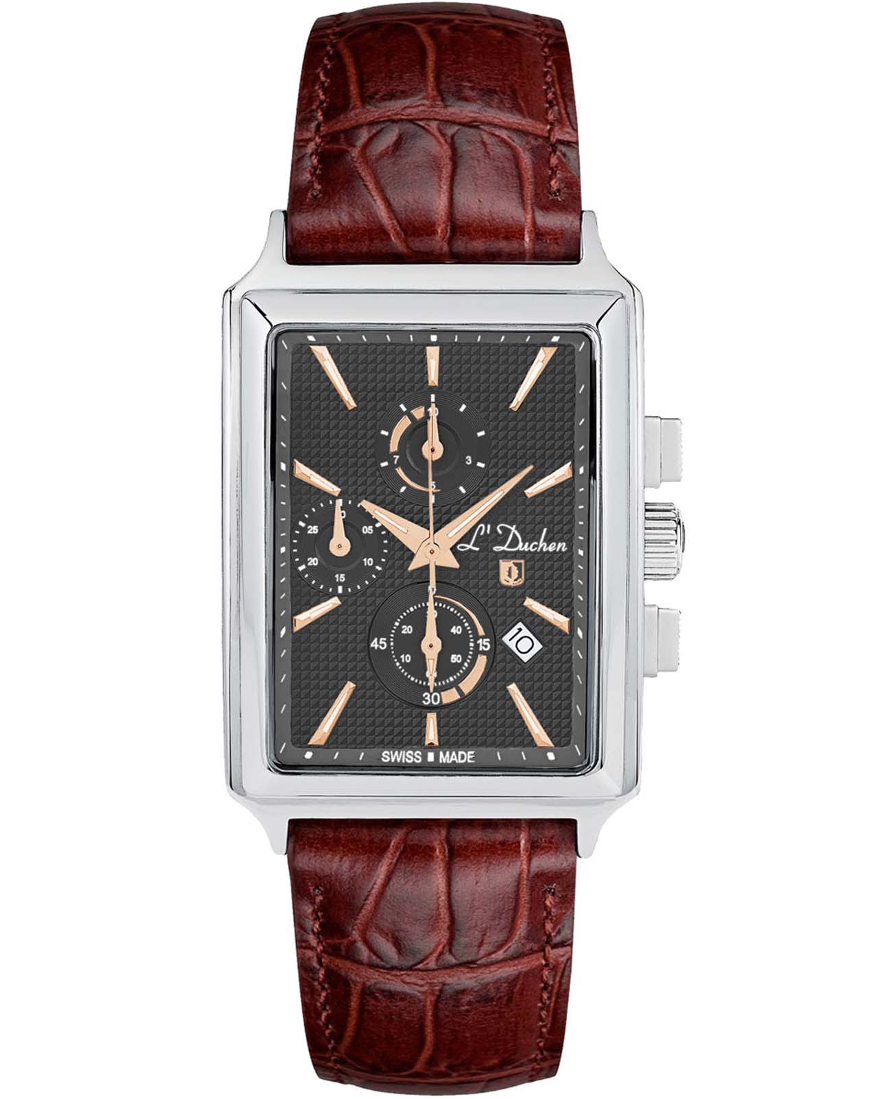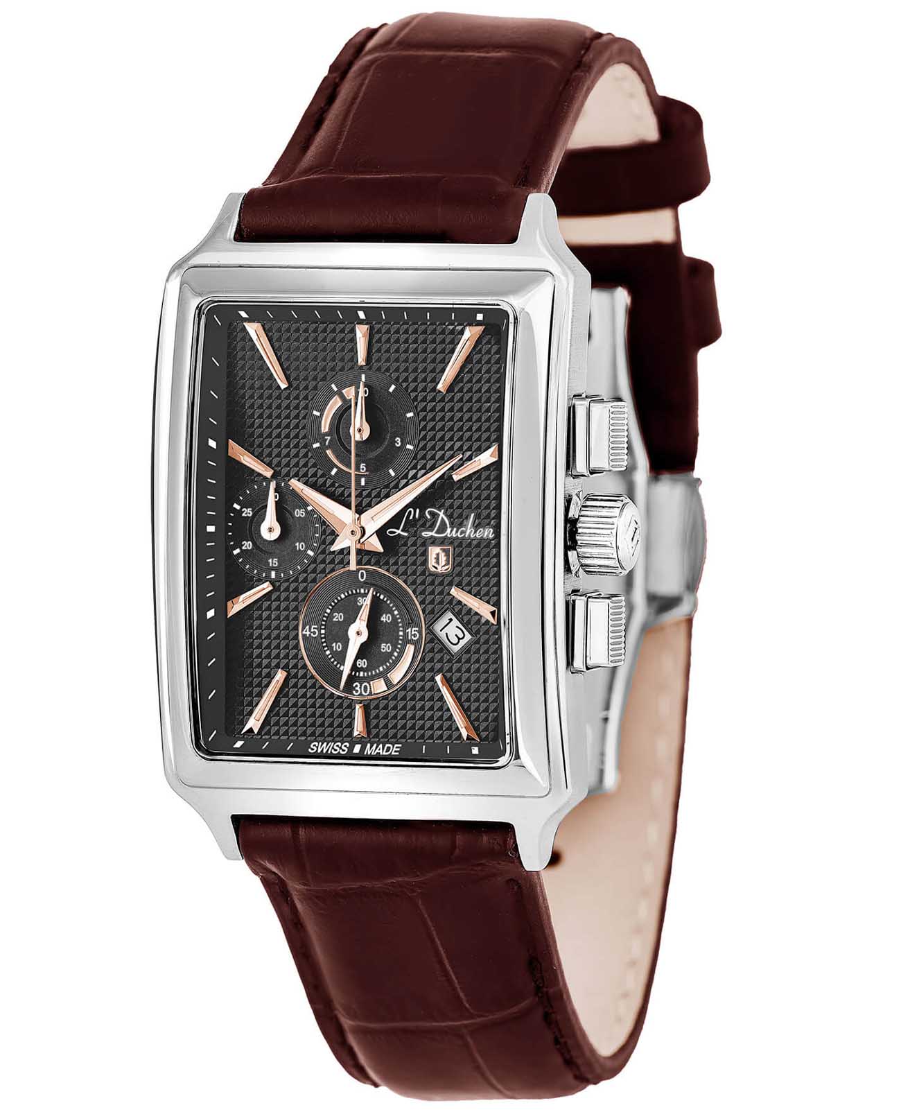 Мужские швейцарские часы- хронографХронографФункция позволяет измерять отрезки времени с особой точностью: часы, минуты, секунды. Верным признаком хронографа является наличие на циферблате 3 дополнительных окошек-счётчиков. L'Duchen Adventure Chrono D 612.12.32, кварцевый механизм с высокой точностью. Сапфировое стеклоСапфировое стеклоПрочный и надёжный материал из кристалла сапфира синтетического происхождения, характеризующийся особой твёрдостью и устойчивостью к царапинам и повреждениям. устойчивое к появлению царапин, обладающее высокой прозрачностью. Корпус часов выполнен из нержавеющей стали. Стрелки с люминесцентным покрытиемЛюминесцентное покрытиеПозволяет считывать показания времени в темноте. Производители наносят на стрелки, часовые индексы, безель или поверхность циферблата светонакопительный состав, дающий холодное свечение.. Окошко даты находится в положении между 4 и 5 часами. Класс водозащиты: 50 метров, позволит защитить корпус от случайных брызг или капель дождя. Кожаный ремешок на застёжке «бабочка» с кнопкамиЗастёжка "бабочка"Такой вид застёжки дополняется предохранителями, помогающими избежать случайного раскрытия браслета. Обладают изящным исполнением. .