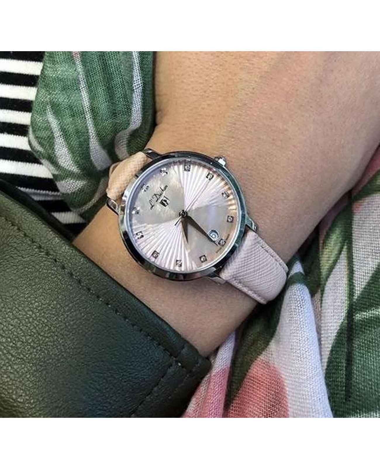 Женские швейцарские часы L'Duchen Eternity D 801.15.35, кварцевый механизм с высокой точностью. Сапфировое стеклоСапфировое стеклоПрочный и надёжный материал из кристалла сапфира синтетического происхождения, характеризующийся особой твёрдостью и устойчивостью к царапинам и повреждениям. устойчивое к появлению царапин, обладающее высокой прозрачностью. Корпус часов выполнен из нержавеющей стали. Окошко даты находится в положении 6 часов. Класс водозащиты: 50 метров, позволит защитить корпус от случайных брызг или капель дождя. Кожаный ремешок на застёжке «бабочка» с кнопкамиЗастёжка "бабочка"Такой вид застёжки дополняется предохранителями, помогающими избежать случайного раскрытия браслета. Обладают изящным исполнением. .