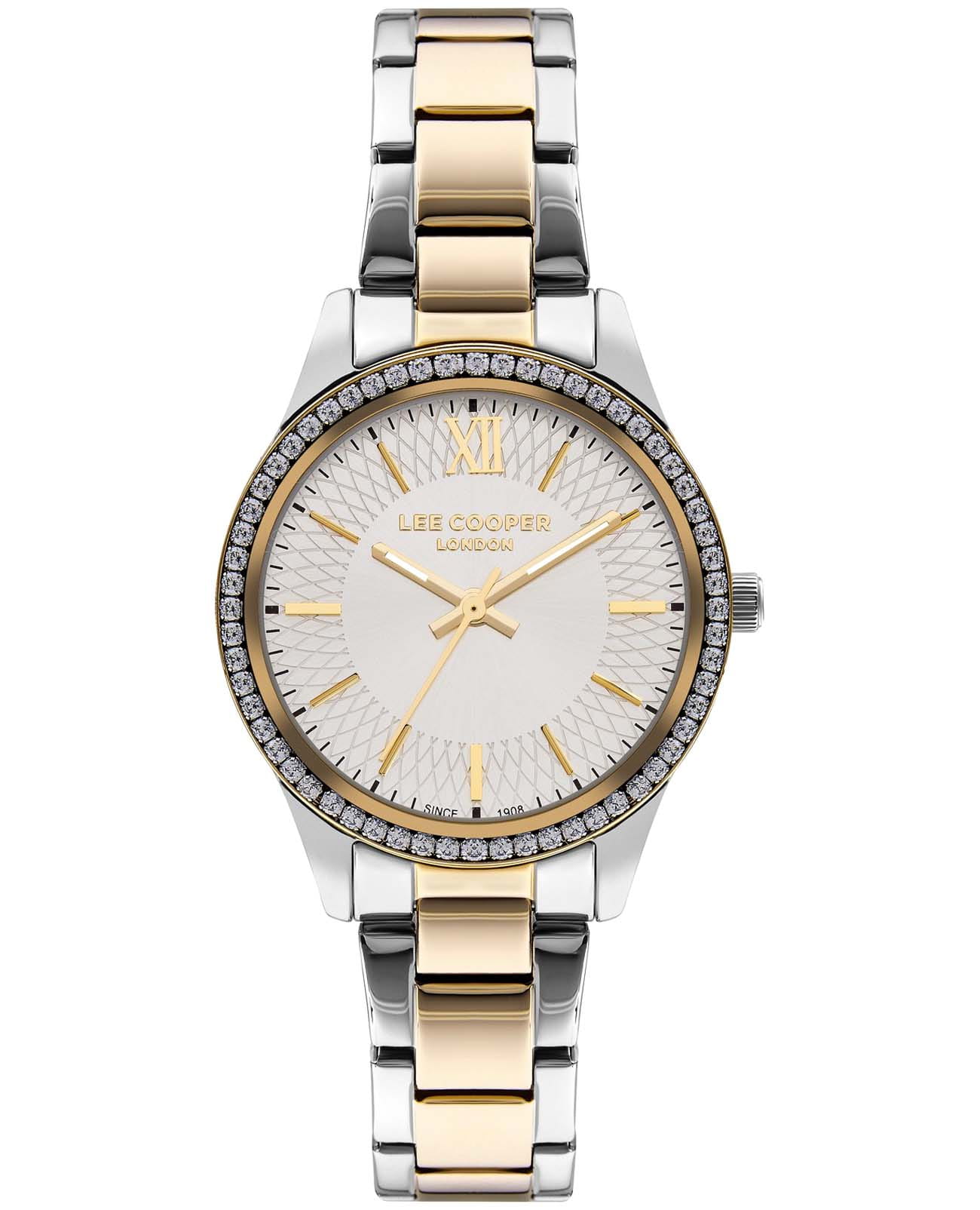 Женские часы Lee Cooper LC07569.230 — это стильное сочетание элегантности и современного дизайна. Круглый корпус диаметром 34 мм выполнен из суперметалла серебристого цвета. Неподвижный безельБезельВнешний ободок, закрепляющий стекло. В спортивных часах так называется поворотное кольцо с делениями на циферблате, выполняет роль таймера – замеряет отрезки времени на шкале. Неподвижный безель – элемент декора. Однонаправленно вращающийся безель на дайверских часах позволяет фиксировать моменты погружения и выныривания на поверхность. с IP-покрытиемIP-покрытиеМетод ионного напыления. Демонстрирует повышенную устойчивость к истиранию, окислению и химическим веществам. Под воздействием высокого давления и температуры около 1500°C молекулы металла надёжно соединяются с частицами корпуса часов. золотого цвета инкрустирован кристаллами, что придает модели особый блеск. Серебристый циферблат защищен минеральным стекломМинеральное стеклоМинеральное стекло представляет собой искусственно выращенный минерал кварца. Такое стекло отличается особой устойчивостью к повреждениям и царапинам. Уступает по некоторым качествам сапфировому стеклу., обеспечивающим устойчивость к царапинам. Часы оснащены надежным кварцевым механизмом, а металлический браслет с частичным IP-покрытиемIP-покрытиеМетод ионного напыления. Демонстрирует повышенную устойчивость к истиранию, окислению и химическим веществам. Под воздействием высокого давления и температуры около 1500°C молекулы металла надёжно соединяются с частицами корпуса часов. на раскладной застёжкеРаскладная застёжкаТакой тип застёжки используется только на браслетах из металла. Она никогда не раскрывается полностью, происходит разделение на 2 и более частей. Раскладывающая застёжка снизит вероятность потери часов к минимуму. гарантирует комфортную посадку на запястье. Стрелки с люминесцентным покрытиемЛюминесцентное покрытиеПозволяет считывать показания времени в темноте. Производители наносят на стрелки, часовые индексы, безель или поверхность циферблата светонакопительный состав, дающий холодное свечение. позволяют легко считывать время даже в условиях недостаточного освещения. Водозащита 30 метров защищает модель от случайных брызг и дождя. Lee Cooper — отличный выбор для тех, кто ценит утонченность и качество.