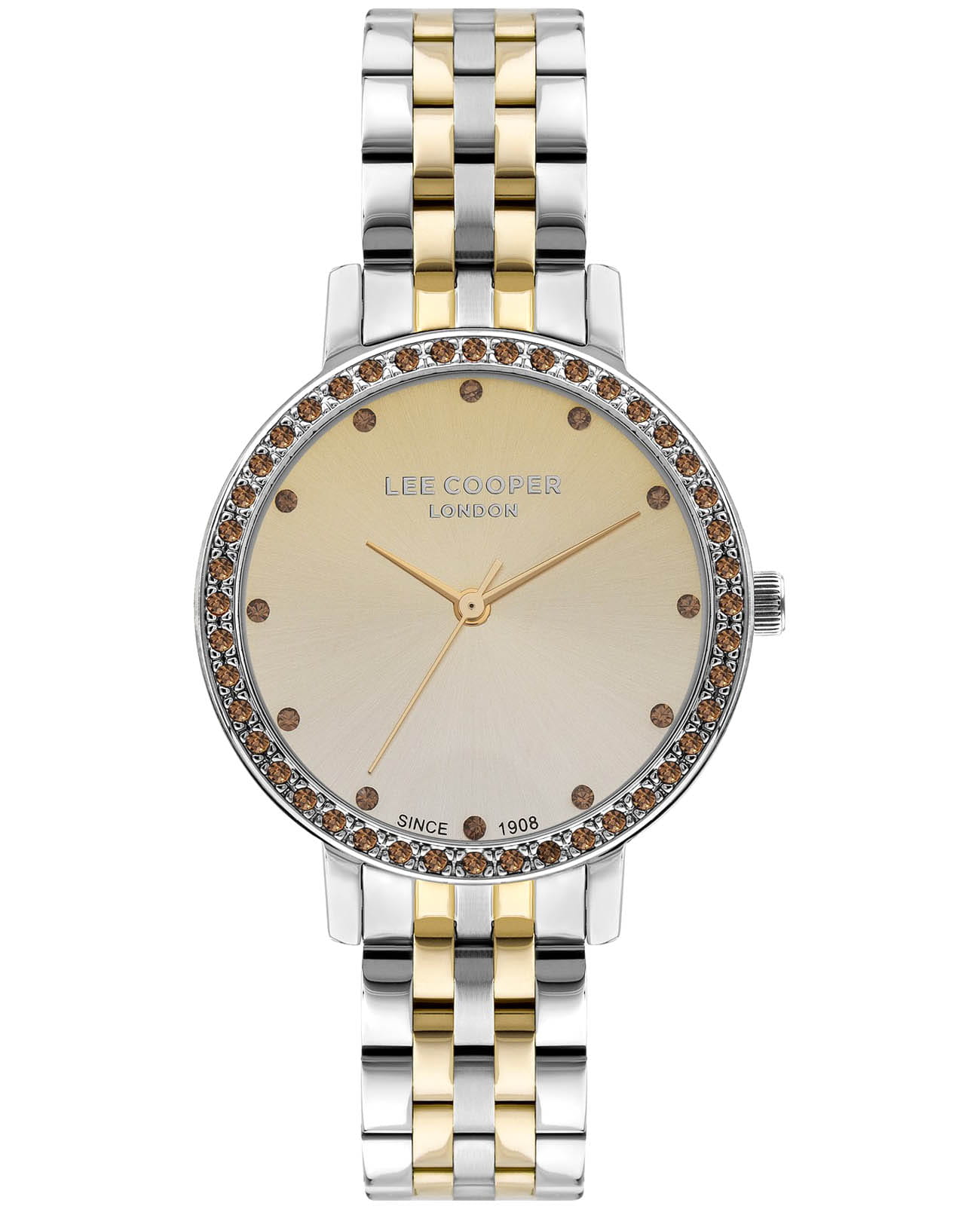 Женские часы Lee Cooper LC07590.210 — это стильное сочетание элегантности и современного дизайна. Круглый корпус диаметром 34 мм выполнен из суперметалла серебристого цвета. Неподвижный безельБезельВнешний ободок, закрепляющий стекло. В спортивных часах так называется поворотное кольцо с делениями на циферблате, выполняет роль таймера – замеряет отрезки времени на шкале. Неподвижный безель – элемент декора. Однонаправленно вращающийся безель на дайверских часах позволяет фиксировать моменты погружения и выныривания на поверхность. инкрустирован цирконами, что придает модели особый блеск. Градиентный циферблат с минималистичными метками в виде точек придает часам элегантность и утонченность, делая их идеальным аксессуаром для любой женщины, а минеральное стеклоМинеральное стеклоМинеральное стекло представляет собой искусственно выращенный минерал кварца. Такое стекло отличается особой устойчивостью к повреждениям и царапинам. Уступает по некоторым качествам сапфировому стеклу., обеспечивает устойчивость к царапинам. Центральные часовая, минутная и секундная стрелки. Часы оснащены надежным кварцевым механизмом, источник питания - батарейка. Металлический браслет с частичным IP-покрытиемIP-покрытиеМетод ионного напыления. Демонстрирует повышенную устойчивость к истиранию, окислению и химическим веществам. Под воздействием высокого давления и температуры около 1500°C молекулы металла надёжно соединяются с частицами корпуса часов. на раскладной застёжкеРаскладная застёжкаТакой тип застёжки используется только на браслетах из металла. Она никогда не раскрывается полностью, происходит разделение на 2 и более частей. Раскладывающая застёжка снизит вероятность потери часов к минимуму. гарантирует комфортную посадку на запястье. Водозащита 30 метров защищает модель от случайных брызг и дождя. Lee Cooper  — отличный выбор для тех, кто ценит утонченность и качество.