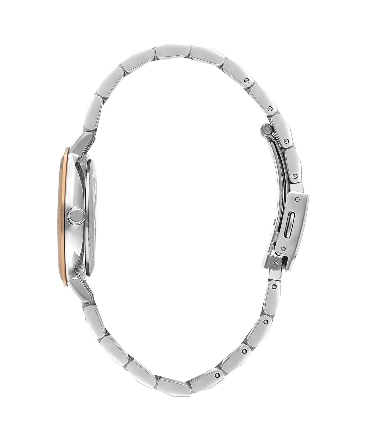 Женские часы Lee Cooper LC07857.530 — это стильное сочетание элегантности и современного дизайна. Изящный круглый корпус диаметром 34 мм выполнен из суперметалла с безелемБезельВнешний ободок, закрепляющий стекло. В спортивных часах так называется поворотное кольцо с делениями на циферблате, выполняет роль таймера – замеряет отрезки времени на шкале. Неподвижный безель – элемент декора. Однонаправленно вращающийся безель на дайверских часах позволяет фиксировать моменты погружения и выныривания на поверхность. с IP-покрытиемIP-покрытиеМетод ионного напыления. Демонстрирует повышенную устойчивость к истиранию, окислению и химическим веществам. Под воздействием высокого давления и температуры около 1500°C молекулы металла надёжно соединяются с частицами корпуса часов. золотого цвета, что придает модели особый блеск. Серебристый циферблат защищен минеральным стекломМинеральное стеклоМинеральное стекло представляет собой искусственно выращенный минерал кварца. Такое стекло отличается особой устойчивостью к повреждениям и царапинам. Уступает по некоторым качествам сапфировому стеклу., обеспечивающим устойчивость к царапинам. Метки в виде штрихов. Часы оснащены надежным кварцевым механизмом, а стальной браслет с частичным IP-покрытиемIP-покрытиеМетод ионного напыления. Демонстрирует повышенную устойчивость к истиранию, окислению и химическим веществам. Под воздействием высокого давления и температуры около 1500°C молекулы металла надёжно соединяются с частицами корпуса часов. на раскладной застёжкеРаскладная застёжкаТакой тип застёжки используется только на браслетах из металла. Она никогда не раскрывается полностью, происходит разделение на 2 и более частей. Раскладывающая застёжка снизит вероятность потери часов к минимуму. гарантирует комфортную посадку на запястье. Водозащита 30 метров защищает модель от случайных брызг и дождя. В комплекте к часам идет дополнительный браслет. Lee Cooper  — отличный выбор для тех, кто ценит утонченность и качество.