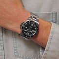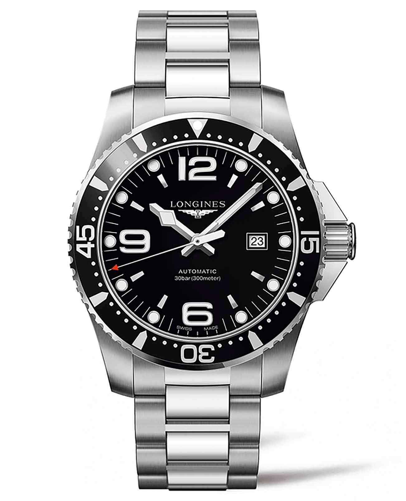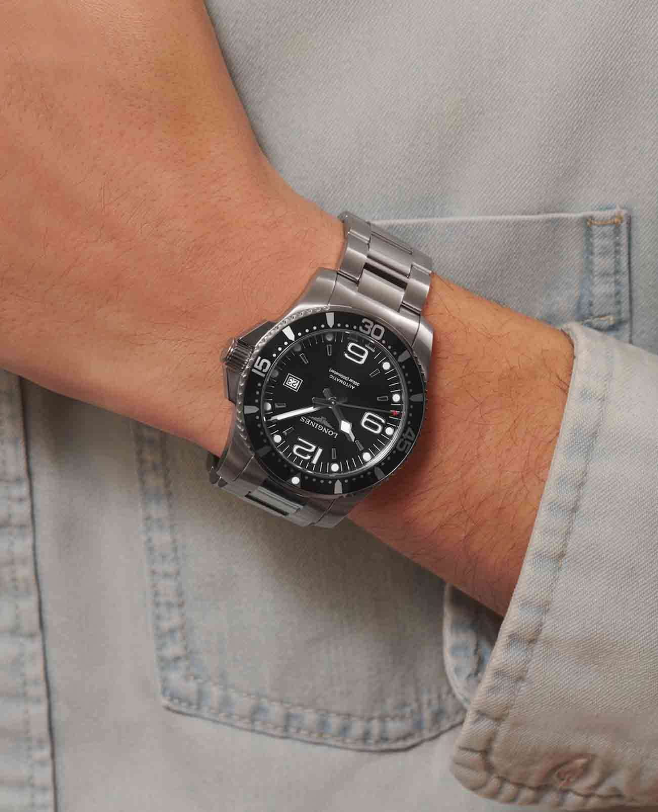 Мужские механические швейцарские часы с автоподзаводом Longines HydroConquest L3.841.4.56.6. Сапфировое стеклоСапфировое стеклоПрочный и надёжный материал из кристалла сапфира синтетического происхождения, характеризующийся особой твёрдостью и устойчивостью к царапинам и повреждениям. с антибликовым покрытием, устойчивое к мелким механическим повреждениям. Корпус часов изготовлен из нержавеющей стали. Вращающийся стальной безельБезельВнешний ободок, закрепляющий стекло. В спортивных часах так называется поворотное кольцо с делениями на циферблате, выполняет роль таймера – замеряет отрезки времени на шкале. Неподвижный безель – элемент декора. Однонаправленно вращающийся безель на дайверских часах позволяет фиксировать моменты погружения и выныривания на поверхность. с люминесцентным покрытиемЛюминесцентное покрытиеПозволяет считывать показания времени в темноте. Производители наносят на стрелки, часовые индексы, безель или поверхность циферблата светонакопительный состав, дающий холодное свечение. Superluminova из нержавеющей стали и керамики, защищенный от царапин, никогда не изнашивается и не выцветает. Стрелки и метки с люминесцентным покрытиемЛюминесцентное покрытиеПозволяет считывать показания времени в темноте. Производители наносят на стрелки, часовые индексы, безель или поверхность циферблата светонакопительный состав, дающий холодное свечение.. Окошко даты находится в положении 3 часа. Класс водозащиты: 300 метров, позволит плавать, нырять и заниматься другими водными видами спорта. Стальной браслет на раскладной застёжкеРаскладная застёжкаТакой тип застёжки используется только на браслетах из металла. Она никогда не раскрывается полностью, происходит разделение на 2 и более частей. Раскладывающая застёжка снизит вероятность потери часов к минимуму..