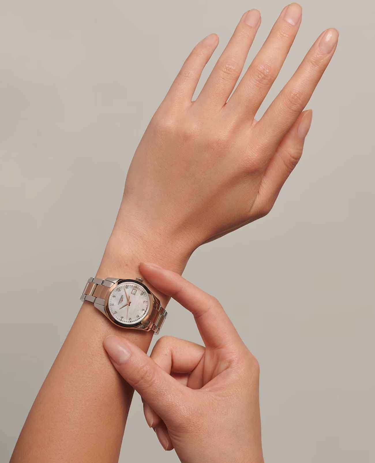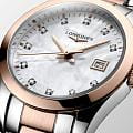 Женские швейцарские часы Longines Conquest Classic L2.286.3.87.7 — это изысканный аксессуар, способный подчеркнуть ваш безупречный вкус и деловой стиль. Модель с белым перламутровым циферблатом, выполненным из высококачественной нержавеющей стали 316L с элегантным безелемБезельВнешний ободок, закрепляющий стекло. В спортивных часах так называется поворотное кольцо с делениями на циферблате, выполняет роль таймера – замеряет отрезки времени на шкале. Неподвижный безель – элемент декора. Однонаправленно вращающийся безель на дайверских часах позволяет фиксировать моменты погружения и выныривания на поверхность. с розово-золотистым PVD-покрытиемPVDУльтратонкое покрытие наносится в технике вакуумного напыления, сочетает в себе нитрид титана особой прочности со слоем золота или оксида хрома. Несёт в себе декоративную или защитную функцию., обладает исключительной устойчивостью к деформации и повреждениям. Циферблат украшен 11 бриллиантами общей массой 0.055 карата, придающими часам особое очарование и блеск. Швейцарский кварцевый калибр L152 обеспечивает безупречную точность хода, а многослойное сапфировое стеклоСапфировое стеклоПрочный и надёжный материал из кристалла сапфира синтетического происхождения, характеризующийся особой твёрдостью и устойчивостью к царапинам и повреждениям. с антибликовым покрытиемАнтибликовое покрытиеСлой оксида металла в 0,13-0,3 микрон, благодаря которому стекло часов не бликует и не отражает свет. Антибликовое покрытие уменьшает отражение света в 10 раз, обеспечивая отличную читаемость показателей циферблата. защищает циферблат от царапин и повреждений, сохраняя его первозданный вид на долгие годы. Среди множества полезных функций этих часов вы найдете отображение даты и EOLEOLПредставляет собой систему, уведомляющую владельца часов о необходимости замены элемента питания. За 2 недели до полного разряда батарейки секундная стрелка перестаёт ходить чётко и начинает перепрыгивать на 3-4 деления., что делает их не только стильным украшением, но и практичным инструментом для повседневного использования. Стальной браслет с розово-золотистым IP-покрытиемIP-покрытиеМетод ионного напыления. Демонстрирует повышенную устойчивость к истиранию, окислению и химическим веществам. Под воздействием высокого давления и температуры около 1500°C молекулы металла надёжно соединяются с частицами корпуса часов. и с удобной застежкой «бабочка»Застёжка "бабочка"Такой вид застёжки дополняется предохранителями, помогающими избежать случайного раскрытия браслета. Обладают изящным исполнением. обеспечивает комфортную посадку на запястье.