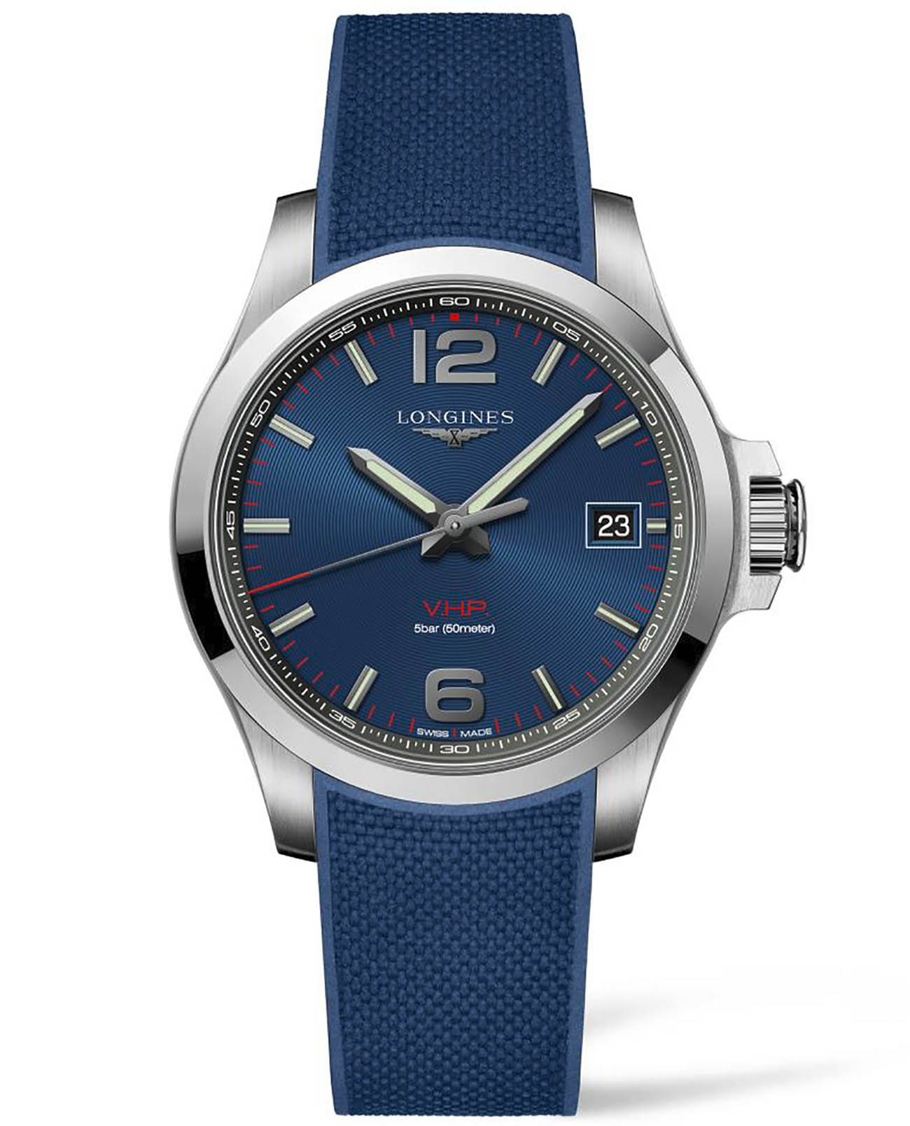 Мужские швейцарские часы Longines Conquest V.H.P. L3.716.4.96.9 станут гармоничным завершением образа. Синий ремешок из каучука стильно смотрится на запястье. Швейцарский кварцевый механизм L288 демонстрирует абсолютную точность хода. Устойчивое к царапинам сапфировое стекло имеет антибликовое покрытиеАнтибликовое покрытиеСлой оксида металла в 0,13-0,3 микрон, благодаря которому стекло часов не бликует и не отражает свет. Антибликовое покрытие уменьшает отражение света в 10 раз, обеспечивая отличную читаемость показателей циферблата.. Функции: вечный календарь, индикатор EOLEOLПредставляет собой систему, уведомляющую владельца часов о необходимости замены элемента питания. За 2 недели до полного разряда батарейки секундная стрелка перестаёт ходить чётко и начинает перепрыгивать на 3-4 деления., хронограф. Производство и сборка: Швейцария.