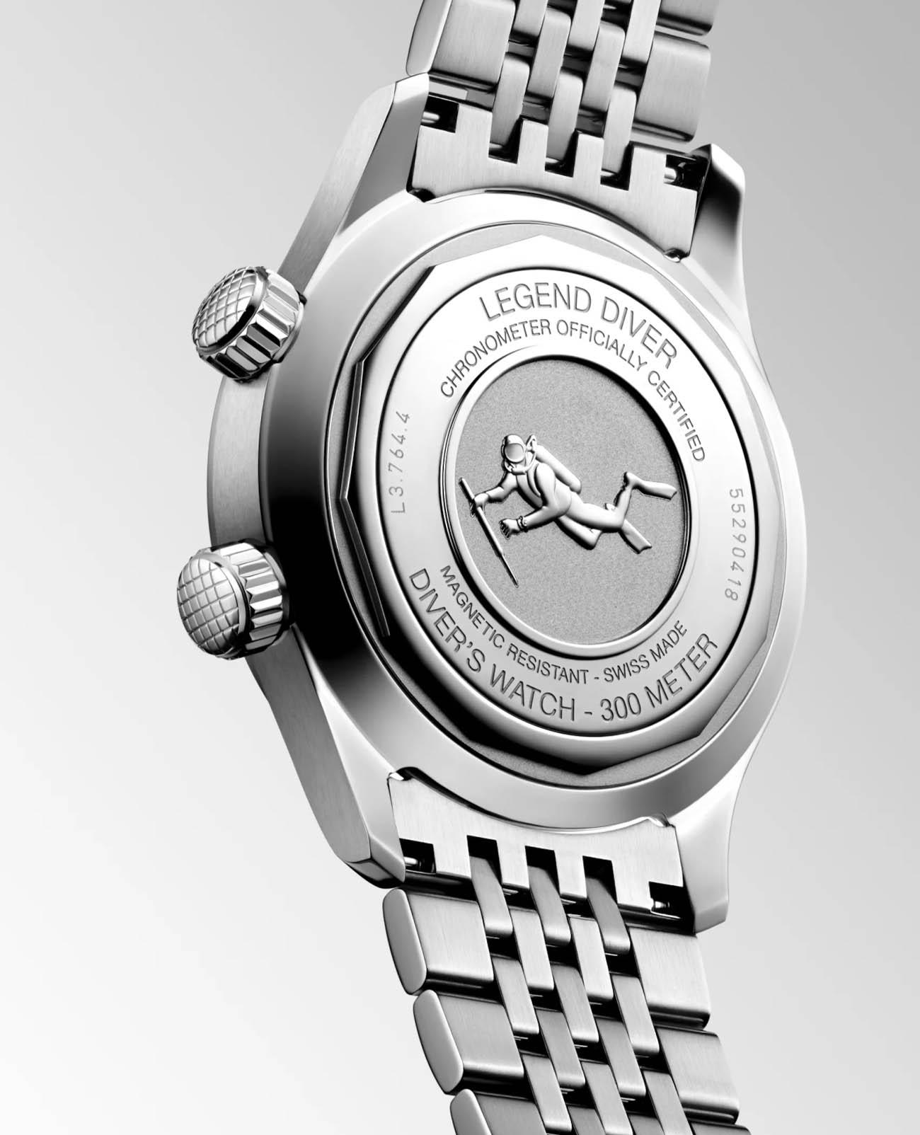 Швейцарские мужские механические часы Longines Legend Diver L3.764.4.96.6 – спортивный аксессуар в дайверском стиле. Циферблат отличается улучшенной читабельностью показателей благодаря крупной индикации времени, стрелками и метками с люминесцентной подсветкойЛюминесцентное покрытиеПозволяет считывать показания времени в темноте. Производители наносят на стрелки, часовые индексы, безель или поверхность циферблата светонакопительный состав, дающий холодное свечение. Super-LumiNova, антибликовому покрытиюАнтибликовое покрытиеСлой оксида металла в 0,13-0,3 микрон, благодаря которому стекло часов не бликует и не отражает свет. Антибликовое покрытие уменьшает отражение света в 10 раз, обеспечивая отличную читаемость показателей циферблата. сапфирового стеклаСапфировое стеклоПрочный и надёжный материал из кристалла сапфира синтетического происхождения, характеризующийся особой твёрдостью и устойчивостью к царапинам и повреждениям., устойчивого к мелким механическим повреждениям. Швейцарский автоматический механизм L888 имеет запас хода на 72 часа. Водозащита 300 метров, позволит плавать, нырять и заниматься другими водными видами спорта. Стальной браслет на раскладной застёжкеРаскладная застёжкаТакой тип застёжки используется только на браслетах из металла. Она никогда не раскрывается полностью, происходит разделение на 2 и более частей. Раскладывающая застёжка снизит вероятность потери часов к минимуму..