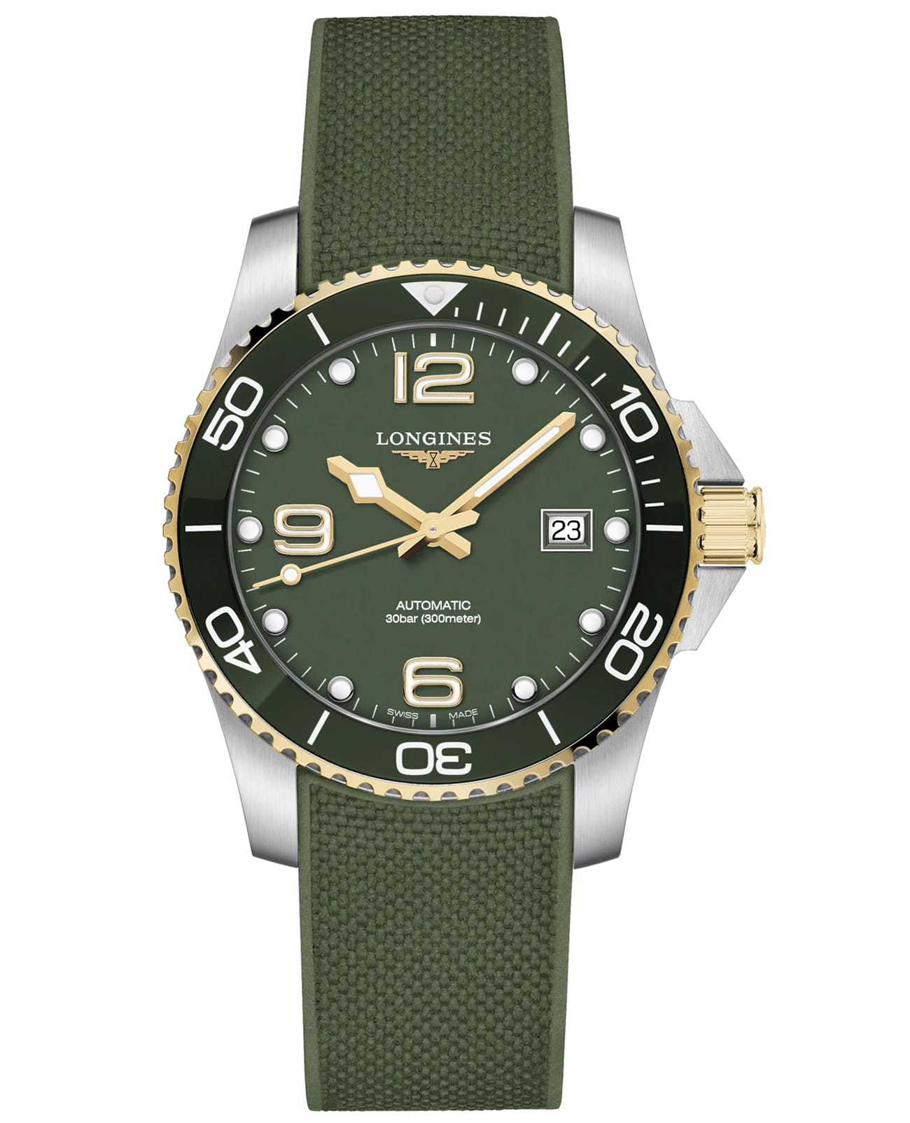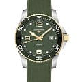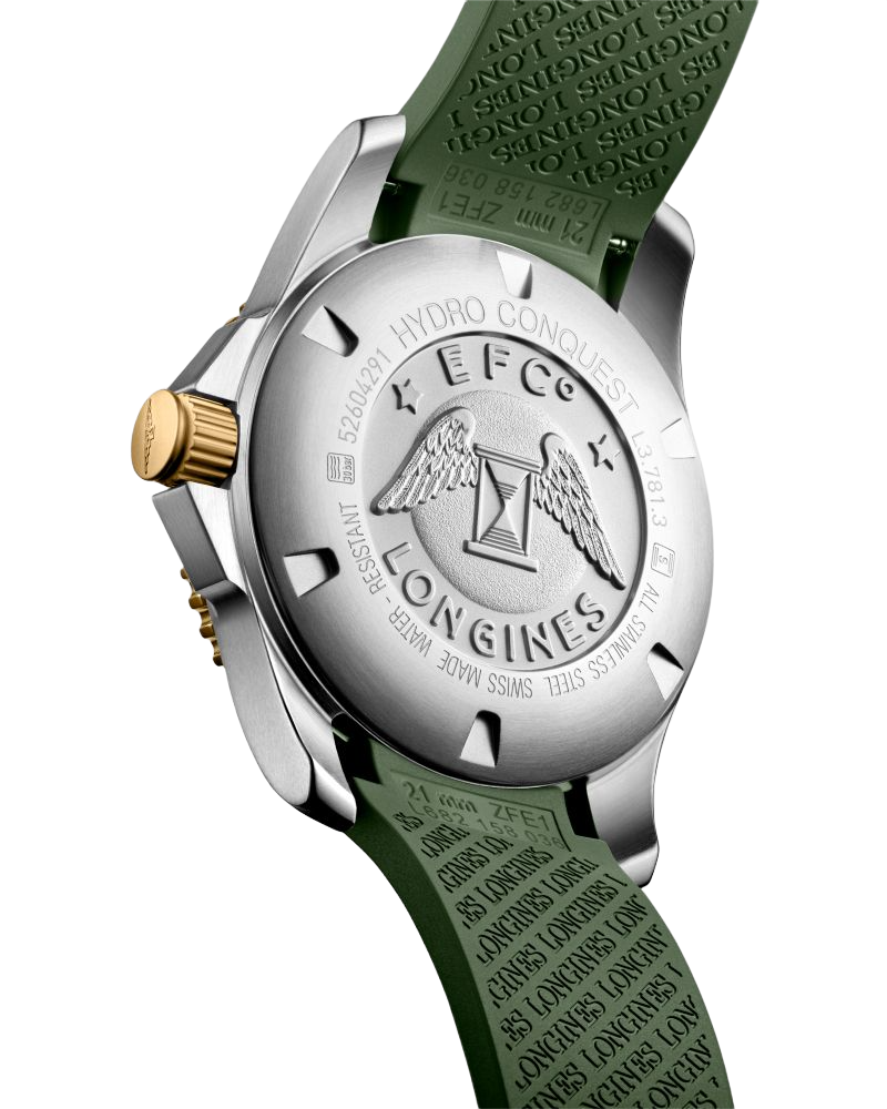 Мужские механические швейцарские часы с автоподзаводом Longines HydroConquest L3.781.3.06.9. Сапфировое стеклоСапфировое стеклоПрочный и надёжный материал из кристалла сапфира синтетического происхождения, характеризующийся особой твёрдостью и устойчивостью к царапинам и повреждениям. с антибликовым покрытием, устойчивое к мелким механическим повреждениям. Корпус часов изготовлен из нержавеющей стали. Вращающийся стальной безельБезельВнешний ободок, закрепляющий стекло. В спортивных часах так называется поворотное кольцо с делениями на циферблате, выполняет роль таймера – замеряет отрезки времени на шкале. Неподвижный безель – элемент декора. Однонаправленно вращающийся безель на дайверских часах позволяет фиксировать моменты погружения и выныривания на поверхность. с люминесцентным покрытиемЛюминесцентное покрытиеПозволяет считывать показания времени в темноте. Производители наносят на стрелки, часовые индексы, безель или поверхность циферблата светонакопительный состав, дающий холодное свечение. Superluminova из нержавеющей стали с PVD-покрытиемPVDУльтратонкое покрытие наносится в технике вакуумного напыления, сочетает в себе нитрид титана особой прочности со слоем золота или оксида хрома. Несёт в себе декоративную или защитную функцию. и керамики, защищенный от царапин, никогда не изнашивается и не выцветает. Стрелки и метки с люминесцентным покрытиемЛюминесцентное покрытиеПозволяет считывать показания времени в темноте. Производители наносят на стрелки, часовые индексы, безель или поверхность циферблата светонакопительный состав, дающий холодное свечение.. Окошко даты находится в положении 3 часа. Класс водозащиты: 300 метров, позволит плавать, нырять и заниматься другими водными видами спорта. Каучуковый ремешок на раскладной застёжкеРаскладная застёжкаТакой тип застёжки используется только на браслетах из металла. Она никогда не раскрывается полностью, происходит разделение на 2 и более частей. Раскладывающая застёжка снизит вероятность потери часов к минимуму. с удлинением для дайверов.