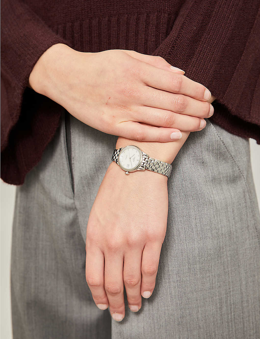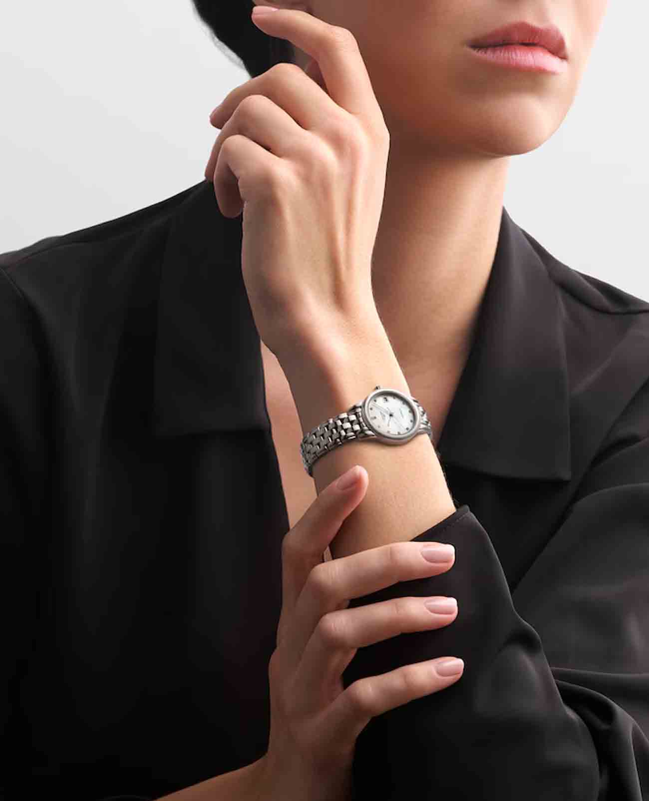 Корпус часов выполнен из прочной стали, что гарантирует их долговечность и надёжность. Циферблат украшен 12 бриллиантами группы Top Wesselton VS-SI, общий вес которых составляет 0.034 карата, что придаёт часам ослепительного блеска и утончённой роскоши. Окошко даты удобно расположено в позиции 3 часа, позволяя быстро узнать текущую дату. Внутри часов спрятан автоматический механизм с частотой баланса 28 800 полуколебаний в час и запасом хода до 45 часов, что обеспечивает их стабильную и точную работу. Класс водозащиты 30 метров защищает часы от случайных брызг или капель дождя.