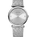 Женские швейцарские часы Longines La Grande Classique L4.512.4.74.6, кварцевый механизм с высокой точностью. Сапфировое стеклоСапфировое стеклоПрочный и надёжный материал из кристалла сапфира синтетического происхождения, характеризующийся особой твёрдостью и устойчивостью к царапинам и повреждениям. устойчивое к появлению царапин, обладающее высокой прозрачностью. Корпус часов изготовлен из стали. Циферблат дополнен 12 бриллиантами. Класс водозащиты: 30 метров, позволит защитить корпус от случайных брызг или капель дождя. Браслет из стали на раскладной застёжкеРаскладная застёжкаТакой тип застёжки используется только на браслетах из металла. Она никогда не раскрывается полностью, происходит разделение на 2 и более частей. Раскладывающая застёжка снизит вероятность потери часов к минимуму..