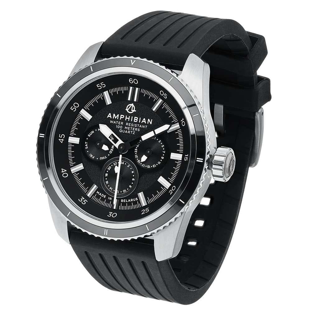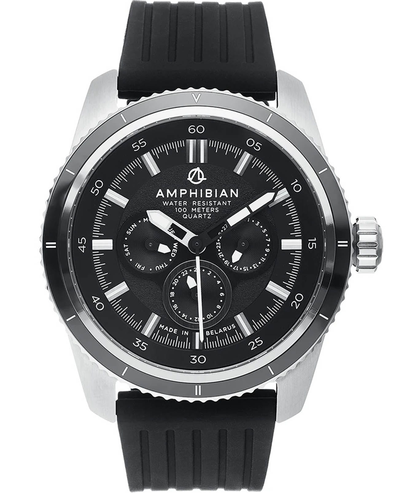 Мужские наручные часы Луч Amphibian 76720563 — это стильное сочетание элегантности и современного дизайна. Элегантный корпус диаметром 46.8 мм выполнен из нержавеющей стали, который придает модели особый изысканный вид. Циферблат защищен сапфировым стекломСапфировое стеклоПрочный и надёжный материал из кристалла сапфира синтетического происхождения, характеризующийся особой твёрдостью и устойчивостью к царапинам и повреждениям., обеспечивающим устойчивость к царапинам. Метки в виде штрихов. Часы оснащены кварцевым механизмом, а силиконовый ремень на стандартной застежке гарантирует комфортную посадку на запястье. Поворотный безельБезельВнешний ободок, закрепляющий стекло. В спортивных часах так называется поворотное кольцо с делениями на циферблате, выполняет роль таймера – замеряет отрезки времени на шкале. Неподвижный безель – элемент декора. Однонаправленно вращающийся безель на дайверских часах позволяет фиксировать моменты погружения и выныривания на поверхность. с PVD-покрытиемPVDУльтратонкое покрытие наносится в технике вакуумного напыления, сочетает в себе нитрид титана особой прочности со слоем золота или оксида хрома. Несёт в себе декоративную или защитную функцию. черного цвета. Вынесенный циферблат с 24-х часовым указателем времени, индикацией даты и дня недели. Стрелки и метки с люминесцентным покрытиемЛюминесцентное покрытиеПозволяет считывать показания времени в темноте. Производители наносят на стрелки, часовые индексы, безель или поверхность циферблата светонакопительный состав, дающий холодное свечение. позволяют легко считывать время даже в условиях недостаточного освещения. Водозащита 10 бар позволит защитить корпус от случайных брызг или капель дождя. Луч — отличный выбор для тех, кто ценит утонченность и качество.