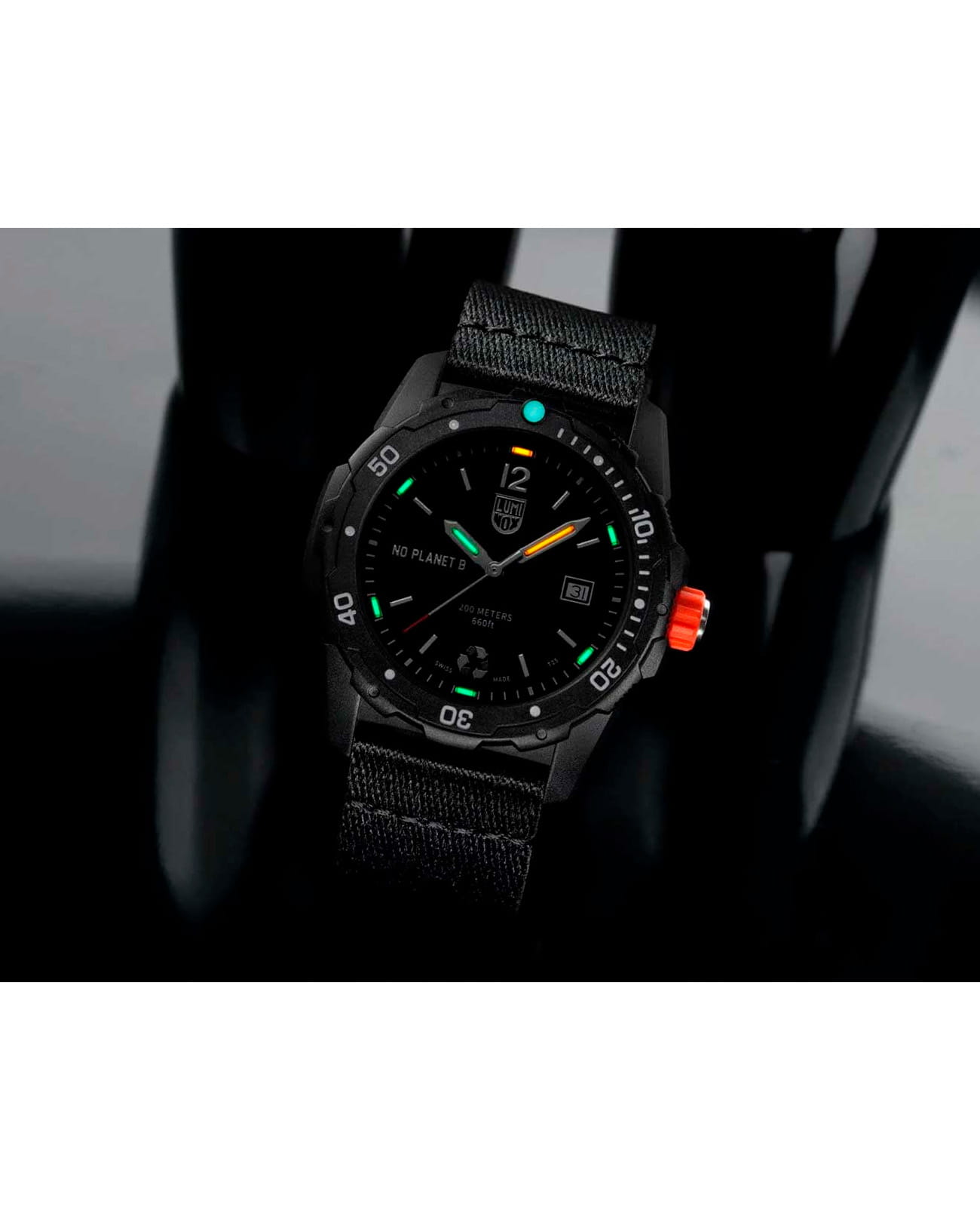 Мужские наручные часы Luminox Bear Grylls Survival ECO NO PLANET B XB.3722.ECO сочетают в себе экологичность и функциональность для любителей активного образа жизни. Модель обладает круглым корпусом диаметром 43 мм, изготовленным из переработанного океанского пластика, что обеспечивает высокую устойчивость к внешним воздействиям при минимальном воздействии на окружающую среду. Браслет выполнен из нейлона черного цвета на стандартной застежке, гарантирующей комфортное ношение и безопасность. Циферблат черного цвета оснащен индикацией времени и даты, а также люминесцентными элементами для видимости в темноте. Для защиты используется минеральное стеклоМинеральное стеклоМинеральное стекло представляет собой искусственно выращенный минерал кварца. Такое стекло отличается особой устойчивостью к повреждениям и царапинам. Уступает по некоторым качествам сапфировому стеклу., обеспечивающее прочную защиту от царапин. Часы комплектуются вращающимся безелемБезельВнешний ободок, закрепляющий стекло. В спортивных часах так называется поворотное кольцо с делениями на циферблате, выполняет роль таймера – замеряет отрезки времени на шкале. Неподвижный безель – элемент декора. Однонаправленно вращающийся безель на дайверских часах позволяет фиксировать моменты погружения и выныривания на поверхность. с односторонним вращением, полезным для подсчета времени погружения или других временных интервалов.Часы работают на кварцевом механизме Ronda 515, который обеспечивает точное время без необходимости подзаводки, при этом срок службы батарейки составляет около 3-4 лет. Водонепроницаемость часов достигает 200 метров (20 атмосфер), что позволяет использовать их при плавании, дайвинге и других водных видах спорта. Luminox XB.3722.ECO — это не просто аксессуар, а инструмент для выживания, созданный в сотрудничестве с Bear Grylls, который подчеркивает важность защиты нашей планеты через использование материалов из переработанного пластика.