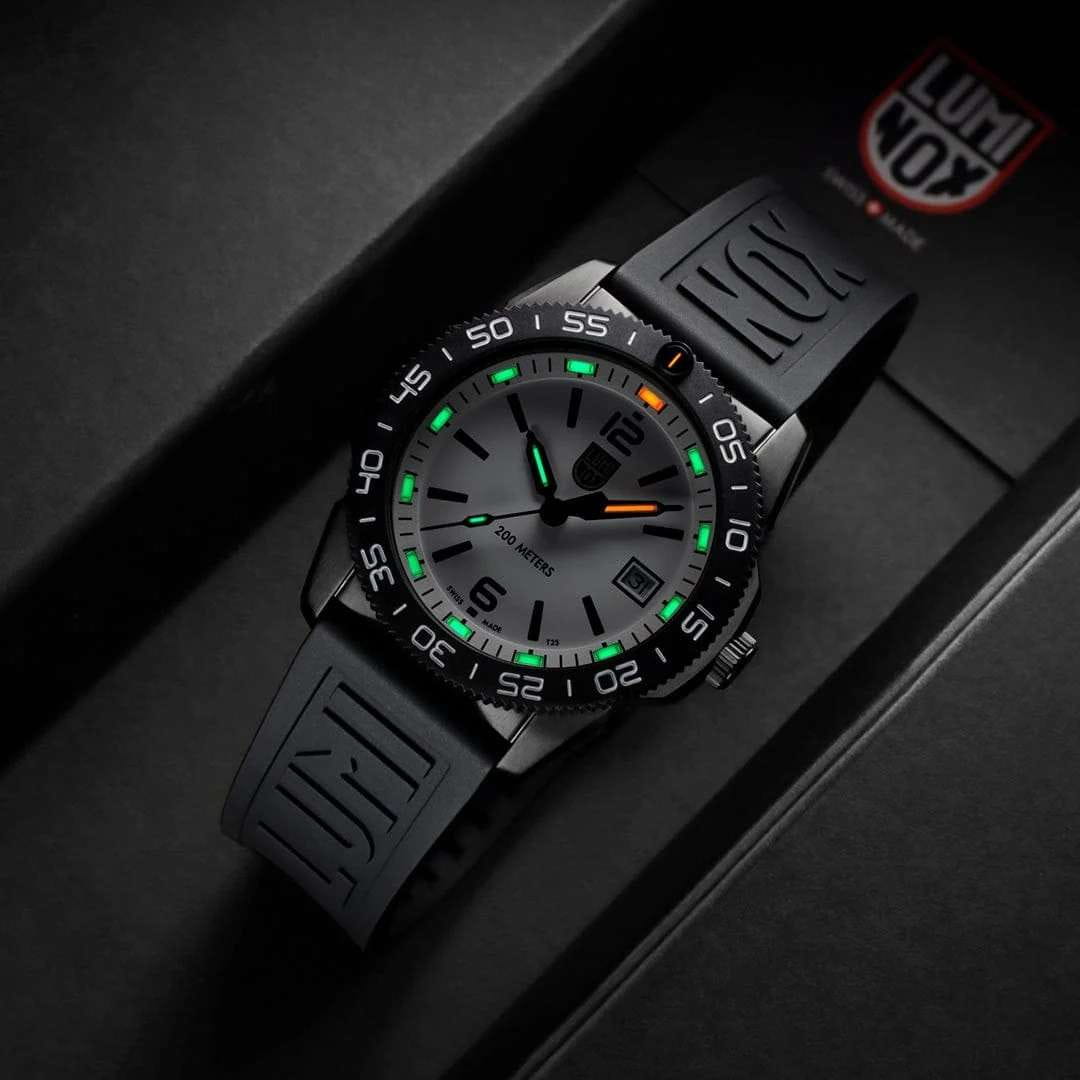 Швейцарские наручные часы Luminox Pacific Diver XS.3127M – это идеальный симбиоз стиля и высокой функциональности. Оснащенные высокоточным кварцевым механизмом, они гарантируют безупречное времяизмерение и надежность в любом случае. Белый циферблат этих часов защищен сапфировым стекломСапфировое стеклоПрочный и надёжный материал из кристалла сапфира синтетического происхождения, характеризующийся особой твёрдостью и устойчивостью к царапинам и повреждениям. с антибликовым покрытиемАнтибликовое покрытиеСлой оксида металла в 0,13-0,3 микрон, благодаря которому стекло часов не бликует и не отражает свет. Антибликовое покрытие уменьшает отражение света в 10 раз, обеспечивая отличную читаемость показателей циферблата., которое славится своей прочностью и устойчивостью к царапинам, обеспечивая кристально чистый обзор. Корпус часов выполнен из качественной стали с черным PVD-покрытиемPVDУльтратонкое покрытие наносится в технике вакуумного напыления, сочетает в себе нитрид титана особой прочности со слоем золота или оксида хрома. Несёт в себе декоративную или защитную функцию., что свидетельствует о долговечности и прочности изделия. Стрелки с LLTLLTLLT — это автономный механизм подсветки, основанный на использовании микроскопических газонаполненных элементов. Специальные герметичные капсулы из боросиликатного стекла, интегрированные в циферблат, генерируют свечение без необходимости подключения к внешним источникам энергии. Для их работы не требуется ни дополнительный свет, ни механическое воздействие (например, нажатие кнопки). Свечение возникает благодаря химическому процессу: реакция между тритием, заключенным в капсулах, и люминофорным покрытием создает стабильное автономное освещение. Технология обеспечивает энергетическую независимость и долговечность подсветки.-подсветкой, обеспечивают отличную видимость даже в условиях недостаточной освещенности, что делает их удобными для использования в любых условиях. Дополнительно часы располагают окошком даты в положении 3 часа, позволяющим быстро и удобно отслеживать текущую дату. Их внушительный класс водозащиты в 200 метров делает их идеальными для любителей водных видов спорта, таких как плавание и ныряние, не беспокоясь о повреждении механизма. Каучуковый ремешок черного цвета, надёжно фиксирующий часы на запястье с помощью раскладной застёжкиРаскладная застёжкаТакой тип застёжки используется только на браслетах из металла. Она никогда не раскрывается полностью, происходит разделение на 2 и более частей. Раскладывающая застёжка снизит вероятность потери часов к минимуму., обеспечивает комфортное ношение в течение всего дня. Стильный вращающийся безельБезельВнешний ободок, закрепляющий стекло. В спортивных часах так называется поворотное кольцо с делениями на циферблате, выполняет роль таймера – замеряет отрезки времени на шкале. Неподвижный безель – элемент декора. Однонаправленно вращающийся безель на дайверских часах позволяет фиксировать моменты погружения и выныривания на поверхность., изготовленный из карбонаКарбонОт «carbon», «carbone» - углерод, углепластик - полимерный композиционный материал из переплетённых под определенным углом между собой нитей углеродного волокна, применяется для изготовления лёгких, но прочных деталей. В часах часто используют 