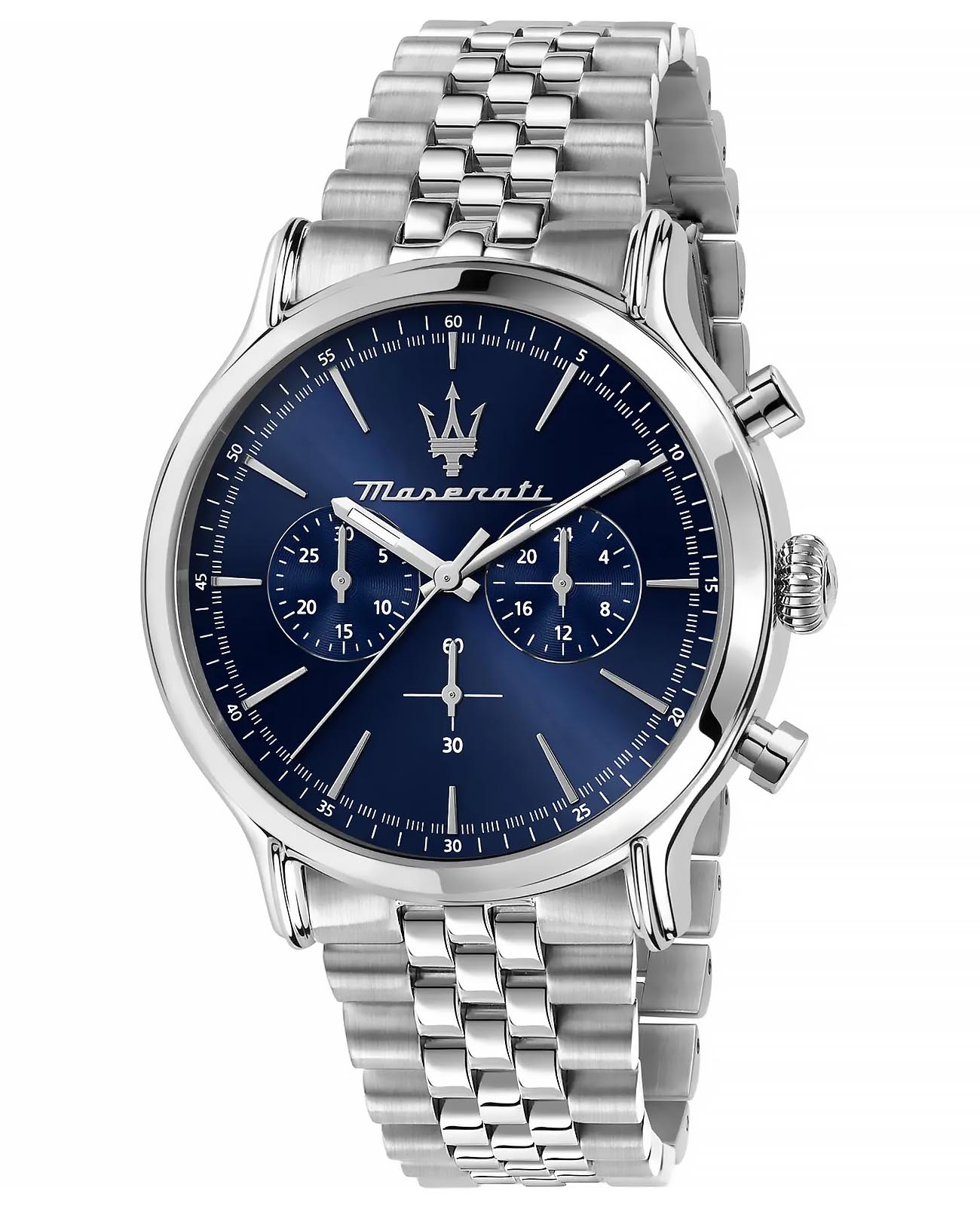 Мужские итальянские часы-хронографХронографФункция позволяет измерять отрезки времени с особой точностью: часы, минуты, секунды. Верным признаком хронографа является наличие на циферблате 3 дополнительных окошек-счётчиков. Maserati Epoca R8873618024, кварцевый механизм с высокой точностью. Минеральное стеклоМинеральное стеклоМинеральное стекло представляет собой искусственно выращенный минерал кварца. Такое стекло отличается особой устойчивостью к повреждениям и царапинам. Уступает по некоторым качествам сапфировому стеклу. устойчивое к появлению царапин и износу. Класс водозащиты: 100 метров, позволит плавать, нырять и заниматься другими водными видами спорта. Корпус часов изготовлен из стали. Люминесцентная подсветкаЛюминесцентное покрытиеПозволяет считывать показания времени в темноте. Производители наносят на стрелки, часовые индексы, безель или поверхность циферблата светонакопительный состав, дающий холодное свечение. стрелок.