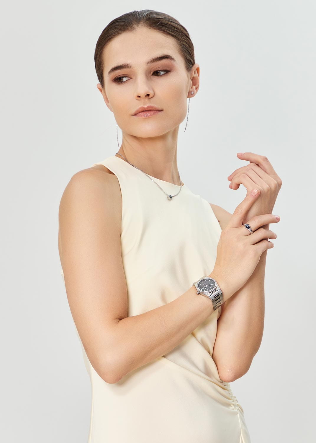 Женские кварцевые часы Mathey-Tissot Zeus D118SAN — это стильное сочетание элегантности и современного дизайна. Изящный корпус выполнен из нержавеющей стали, диаметром 34 мм и толщиной 9 мм, что придаст образу женственности и романтизма. Изысканный циферблат с метками в виде штрихов придает модели особый блеск. Циферблат защищен сапфировым стекломСапфировое стеклоПрочный и надёжный материал из кристалла сапфира синтетического происхождения, характеризующийся особой твёрдостью и устойчивостью к царапинам и повреждениям., обеспечивающий устойчивость к царапинам. Стрелки с люминесцентным покрытиемЛюминесцентное покрытиеПозволяет считывать показания времени в темноте. Производители наносят на стрелки, часовые индексы, безель или поверхность циферблата светонакопительный состав, дающий холодное свечение. SuperLumiNova, которое светится в темноте после непродолжительной зарядки на свету. БезельБезельВнешний ободок, закрепляющий стекло. В спортивных часах так называется поворотное кольцо с делениями на циферблате, выполняет роль таймера – замеряет отрезки времени на шкале. Неподвижный безель – элемент декора. Однонаправленно вращающийся безель на дайверских часах позволяет фиксировать моменты погружения и выныривания на поверхность. украшен кристаллами. Окошко даты находится в положении 3 часа. Часы оснащены надежным кварцевым механизмом. Стальной браслет на застёжке-бабочке с кнопкамиЗастёжка "бабочка"Такой вид застёжки дополняется предохранителями, помогающими избежать случайного раскрытия браслета. Обладают изящным исполнением. , гарантирует комфортное и безопасное ношение. Класс водозащиты: 50 метров позволит защитить корпус от случайных брызг или капель дождя. Mathey-Tissot — отличный выбор для тех, кто ценит утонченность и качество.