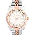 Женские кварцевые часы Mathey-Tissot Rolly D810RA — это стильное сочетание элегантности и современного дизайна. Изящный корпус выполнен из нержавеющей стали, диаметром 30 мм, что придаст образу женственности и романтизма. Изысканный циферблат с метками в виде точек придает модели особый блеск. Циферблат защищен минеральным стекломМинеральное стеклоМинеральное стекло представляет собой искусственно выращенный минерал кварца. Такое стекло отличается особой устойчивостью к повреждениям и царапинам. Уступает по некоторым качествам сапфировому стеклу., обеспечивающий устойчивость к царапинам. Стрелки с люминесцентным покрытиемЛюминесцентное покрытиеПозволяет считывать показания времени в темноте. Производители наносят на стрелки, часовые индексы, безель или поверхность циферблата светонакопительный состав, дающий холодное свечение.. Рифленый безельБезельВнешний ободок, закрепляющий стекло. В спортивных часах так называется поворотное кольцо с делениями на циферблате, выполняет роль таймера – замеряет отрезки времени на шкале. Неподвижный безель – элемент декора. Однонаправленно вращающийся безель на дайверских часах позволяет фиксировать моменты погружения и выныривания на поверхность. с PVD-покрытиемPVDУльтратонкое покрытие наносится в технике вакуумного напыления, сочетает в себе нитрид титана особой прочности со слоем золота или оксида хрома. Несёт в себе декоративную или защитную функцию. цвета розового золота. Циферблат украшен кристаллами. Окошко даты находится в положении 3 часа. Часы оснащены надежным кварцевым механизмом. Стальной браслет с частичным PVD-покрытиемPVDУльтратонкое покрытие наносится в технике вакуумного напыления, сочетает в себе нитрид титана особой прочности со слоем золота или оксида хрома. Несёт в себе декоративную или защитную функцию. на раскладной застёжкеРаскладная застёжкаТакой тип застёжки используется только на браслетах из металла. Она никогда не раскрывается полностью, происходит разделение на 2 и более частей. Раскладывающая застёжка снизит вероятность потери часов к минимуму., гарантирует комфортное и безопасное ношение. Класс водозащиты: 50 метров позволит защитить корпус от случайных брызг или капель дождя. Mathey-Tissot  — отличный выбор для тех, кто ценит утонченность и качество.