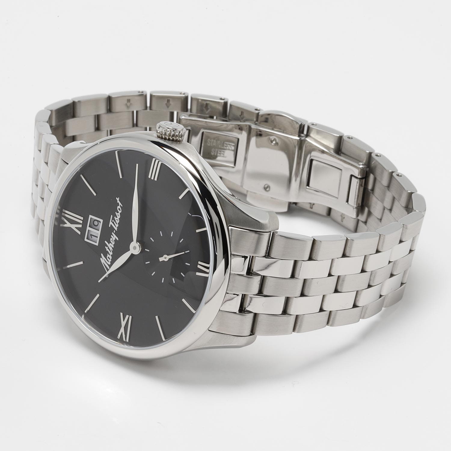Мужские кварцевые часы Mathey-Tissot Edmond Metal H1886MAN — это стильное сочетание элегантности и современного дизайна. Изящный корпус выполнен из нержавеющей стали, диаметром 42 мм, что придаст образу элегантности и надежности. Изысканный циферблат с метками в виде штрихов и римских цифр придает модели особый блеск. Циферблат защищен минеральным стекломМинеральное стеклоМинеральное стекло представляет собой искусственно выращенный минерал кварца. Такое стекло отличается особой устойчивостью к повреждениям и царапинам. Уступает по некоторым качествам сапфировому стеклу. с сапфировым покрытием, обеспечивает устойчивость к царапинам. Окошко даты находится в положении 12 часов. Стальной браслет на застёжке-бабочке с кнопкамиЗастёжка "бабочка"Такой вид застёжки дополняется предохранителями, помогающими избежать случайного раскрытия браслета. Обладают изящным исполнением. , гарантирует комфортное и безопасное ношение. Секундная стрелка вынесена на отдельный циферблат. Рифленая заводная головка. Класс водозащиты: 50 метров позволит защитить корпус от случайных брызг или капель дождя. Mathey-Tissot  — отличный выбор для тех, кто ценит утонченность и качество.