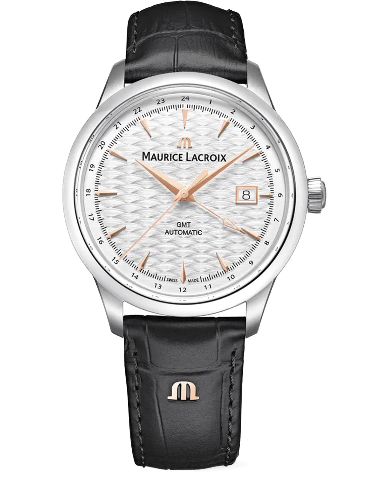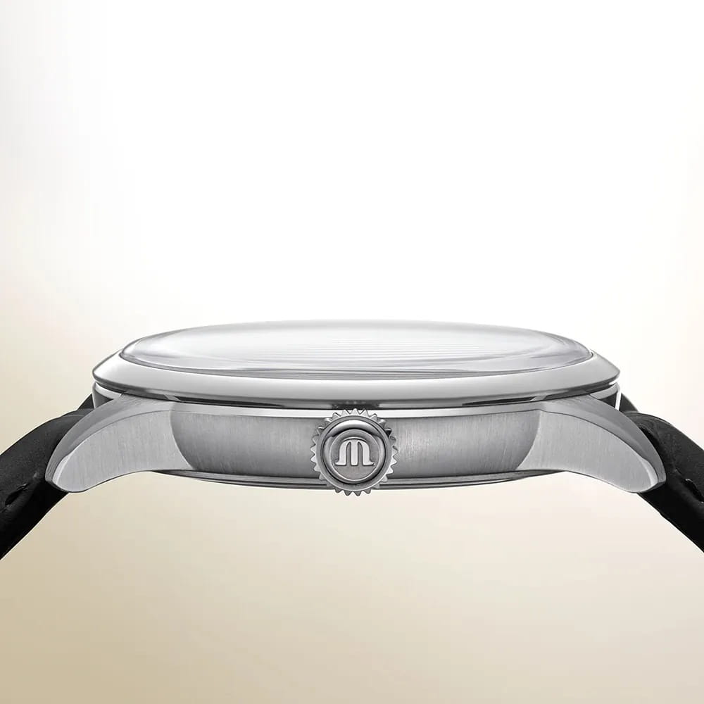 Мужские механические часы Maurice Lacroix 1975 Automatic Vagues Du Jura GMT 756048-SS001-130-2 — это стильный аксессуар, вдохновлённый элегантностью прошлого. Модель выполнена в круглой форме из нержавеющей стали диаметром 40 мм и толщиной 10 мм, что делает её прочной и устойчивой к царапинам. Циферблат серебристого цвета дополнен рисунком «волн Jura», а его поверхность защищена сапфировым стекломСапфировое стеклоПрочный и надёжный материал из кристалла сапфира синтетического происхождения, характеризующийся особой твёрдостью и устойчивостью к царапинам и повреждениям. с двусторонним антибликовым покрытиемАнтибликовое покрытиеСлой оксида металла в 0,13-0,3 микрон, благодаря которому стекло часов не бликует и не отражает свет. Антибликовое покрытие уменьшает отражение света в 10 раз, обеспечивая отличную читаемость показателей циферблата., устойчивым к повреждениям. Стрелки и индексы имеют PVD-покрытиеPVDУльтратонкое покрытие наносится в технике вакуумного напыления, сочетает в себе нитрид титана особой прочности со слоем золота или оксида хрома. Несёт в себе декоративную или защитную функцию. цвета розового золота, а секундная стрелка также покрыта этим материалом. Часы оснащены автоматическим механизмом ML165, обеспечивающим запас хода до 56 часов и частоту колебаний 28 800 полуколебаний в час. Функциональность модели включает отображение времени (часы, минуты, секунды), даты в положении 3 часов. Задняя крышка имеет специальную гравировку. Браслет из чёрной кожи шириной 20 мм оснащён раскладной застёжкойРаскладная застёжкаТакой тип застёжки используется только на браслетах из металла. Она никогда не раскрывается полностью, происходит разделение на 2 и более частей. Раскладывающая застёжка снизит вероятность потери часов к минимуму., обеспечивающей комфорт и надёжную фиксацию на запястье. Водонепроницаемость позволяет использовать модель при мытье рук или под лёгким дождём. Гарантия 2 года подтверждает качество и долговечность изделия. Эти часы станут универсальным аксессуаром для тех, кто ценит сочетание стиля, функциональности и швейцарского мастерства — идеальный выбор для повседневной носки и активного образа жизни.