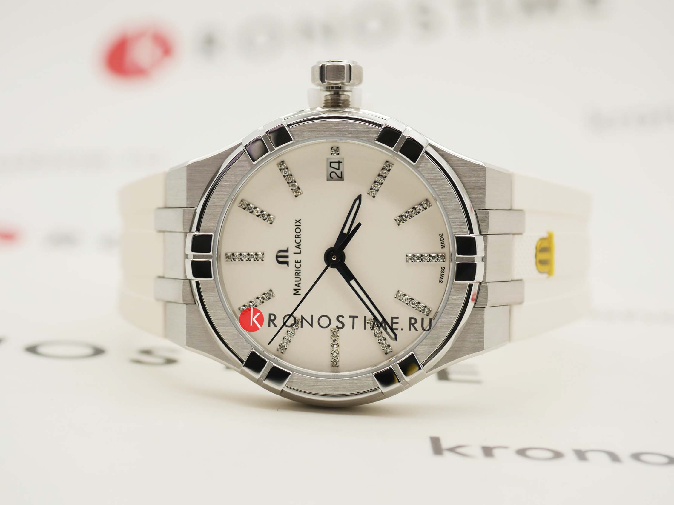 Мужские швейцарские кварцевые часы Maurice Lacroix Aikon Quartz AI1106-SS002-150-1. Сапфировое стеклоСапфировое стеклоПрочный и надёжный материал из кристалла сапфира синтетического происхождения, характеризующийся особой твёрдостью и устойчивостью к царапинам и повреждениям. устойчивое к появлению царапин, обладающее высокой прозрачностью. Белый циферблат. Стрелки с люминесцентным покрытиемЛюминесцентное покрытиеПозволяет считывать показания времени в темноте. Производители наносят на стрелки, часовые индексы, безель или поверхность циферблата светонакопительный состав, дающий холодное свечение.. Метки на циферблате украшены бриллиантами. Класс водозащиты: 100 метров, позволит плавать, нырять и заниматься другими водными видами спорта. Окошко даты находится в положении 3 часов. Корпус и браслет часов изготовлены из стали с частичным. Каучуковый ремешок с классической застежкой.