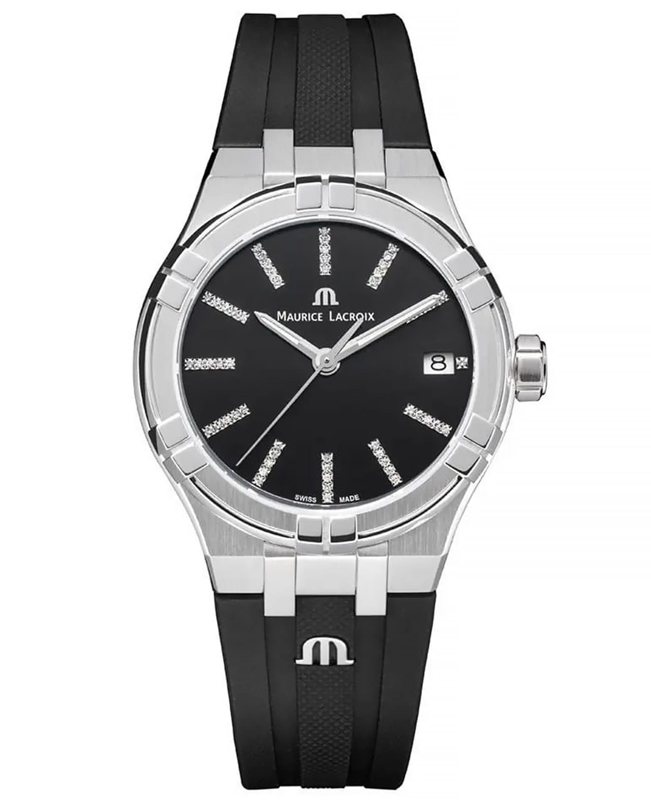 Мужские швейцарские кварцевые часы Maurice Lacroix Aikon Quartz AI1106-SS000-350-2. Сапфировое стеклоСапфировое стеклоПрочный и надёжный материал из кристалла сапфира синтетического происхождения, характеризующийся особой твёрдостью и устойчивостью к царапинам и повреждениям. устойчивое к появлению царапин, обладающее высокой прозрачностью. Черный циферблат. Стрелки с люминесцентным покрытиемЛюминесцентное покрытиеПозволяет считывать показания времени в темноте. Производители наносят на стрелки, часовые индексы, безель или поверхность циферблата светонакопительный состав, дающий холодное свечение.. Метки на циферблате украшены бриллиантами. Класс водозащиты: 100 метров, позволит плавать, нырять и заниматься другими водными видами спорта. Окошко даты находится в положении 3 часов. Корпус и браслет часов изготовлены из стали с частичным. Каучуковый ремешок с классической застежкой.