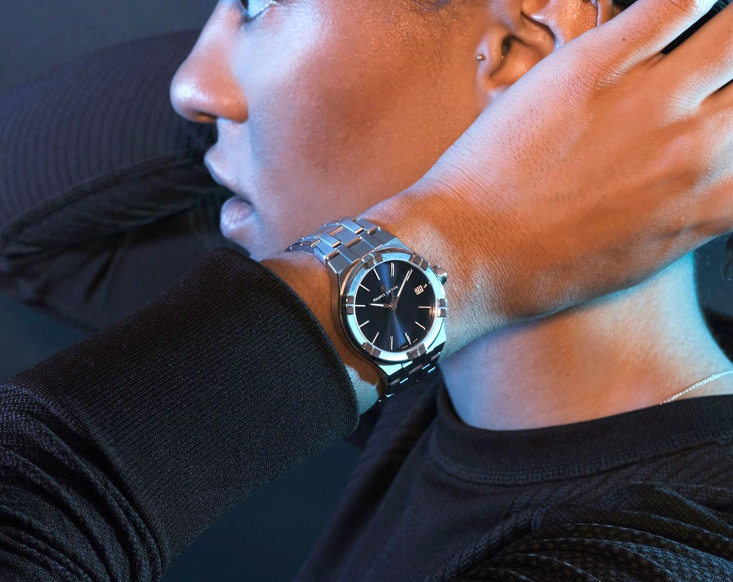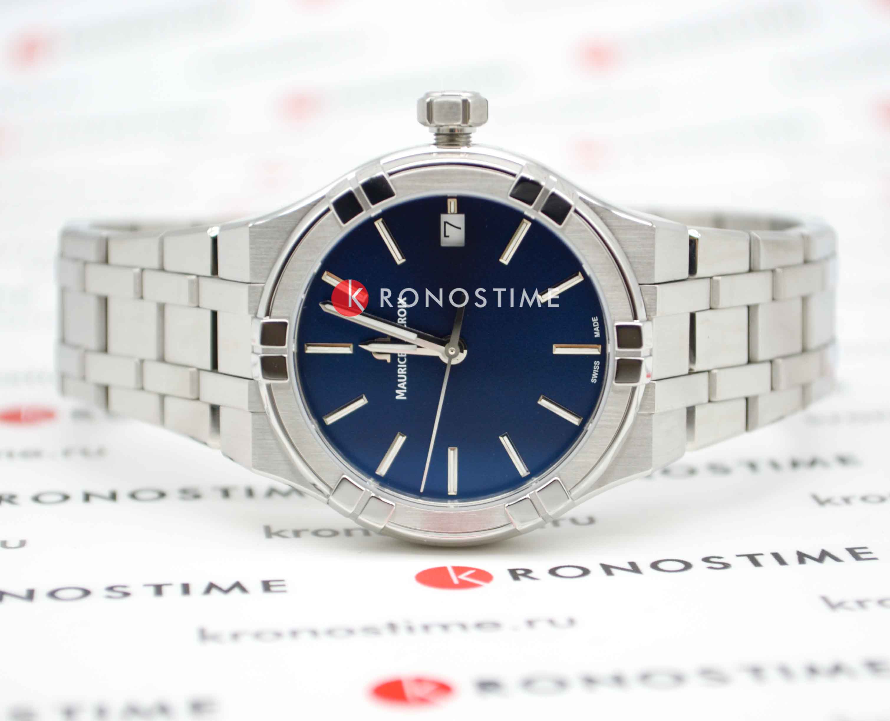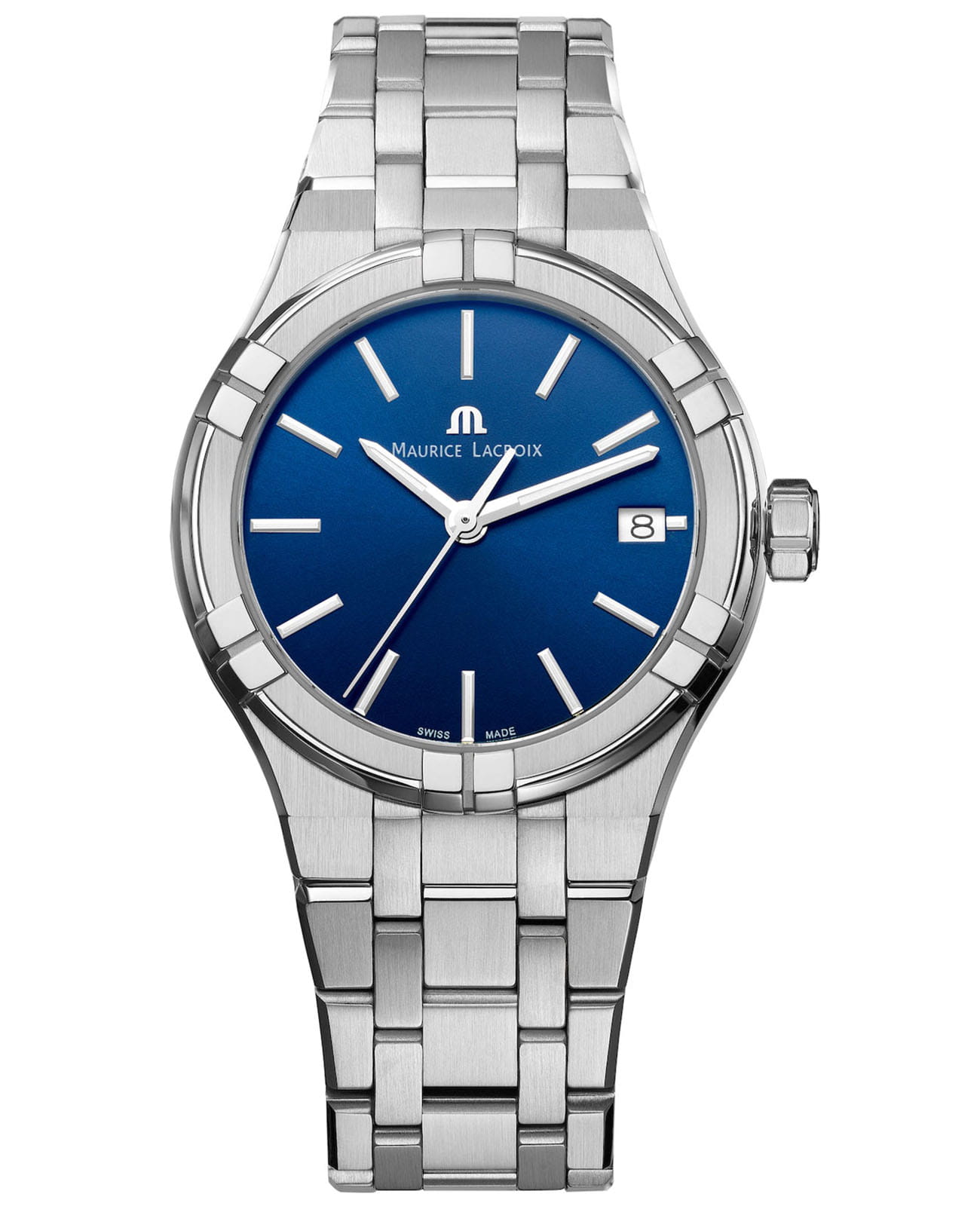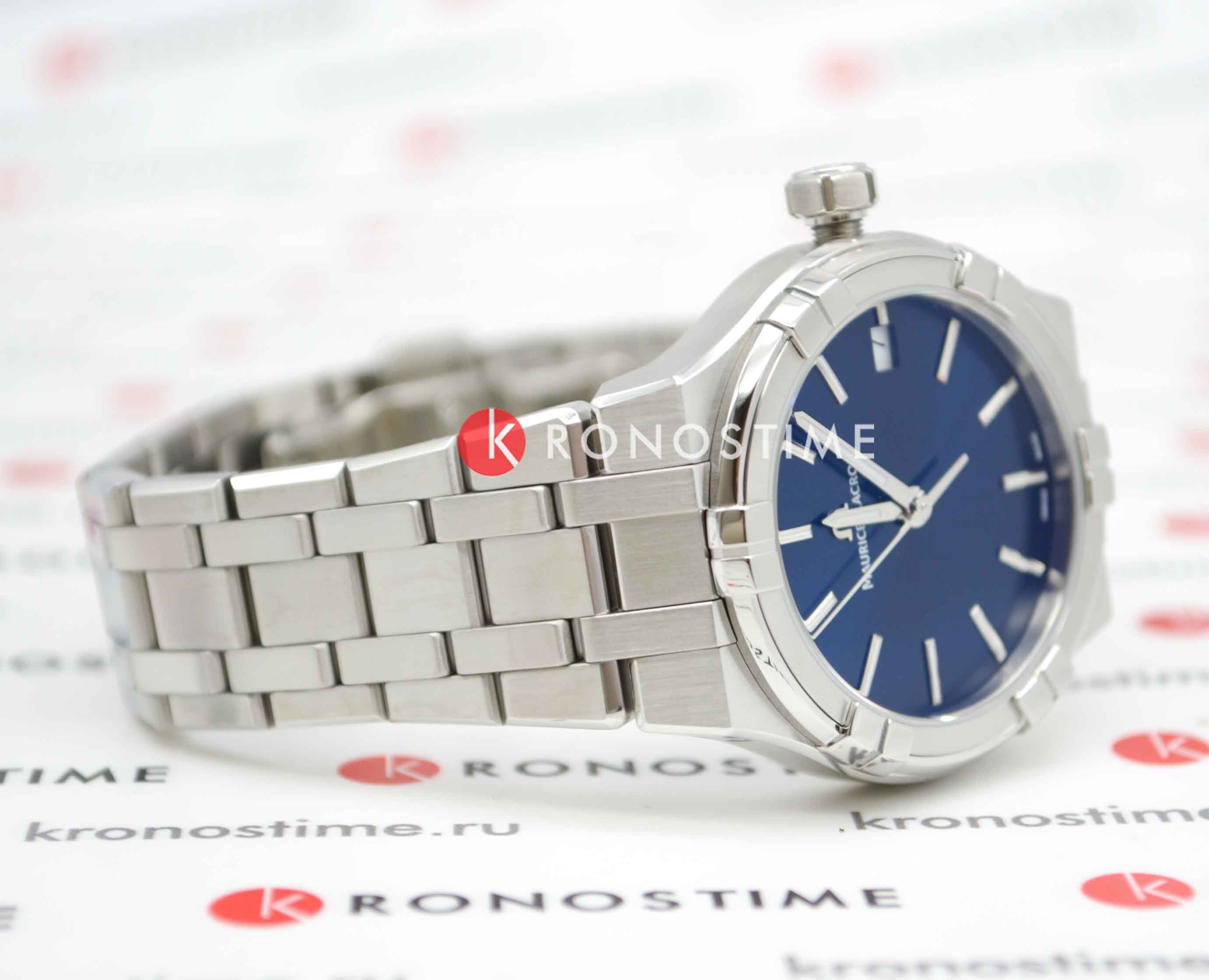Мужские швейцарские кварцевые часы Maurice Lacroix Aikon Quartz AI1106-SS002-430-1. Сапфировое стеклоСапфировое стеклоПрочный и надёжный материал из кристалла сапфира синтетического происхождения, характеризующийся особой твёрдостью и устойчивостью к царапинам и повреждениям. устойчивое к появлению царапин, обладающее высокой прозрачностью. Синий циферблат. Стрелки с люминесцентным покрытиемЛюминесцентное покрытиеПозволяет считывать показания времени в темноте. Производители наносят на стрелки, часовые индексы, безель или поверхность циферблата светонакопительный состав, дающий холодное свечение.. Класс водозащиты: 100 метров, позволит плавать, нырять и заниматься другими водными видами спорта. Окошко даты находится в положении 3 часов. Корпус и браслет часов изготовлены из стали. Браслет с застёжкой «бабочка» с кнопкамиЗастёжка "бабочка"Такой вид застёжки дополняется предохранителями, помогающими избежать случайного раскрытия браслета. Обладают изящным исполнением. .