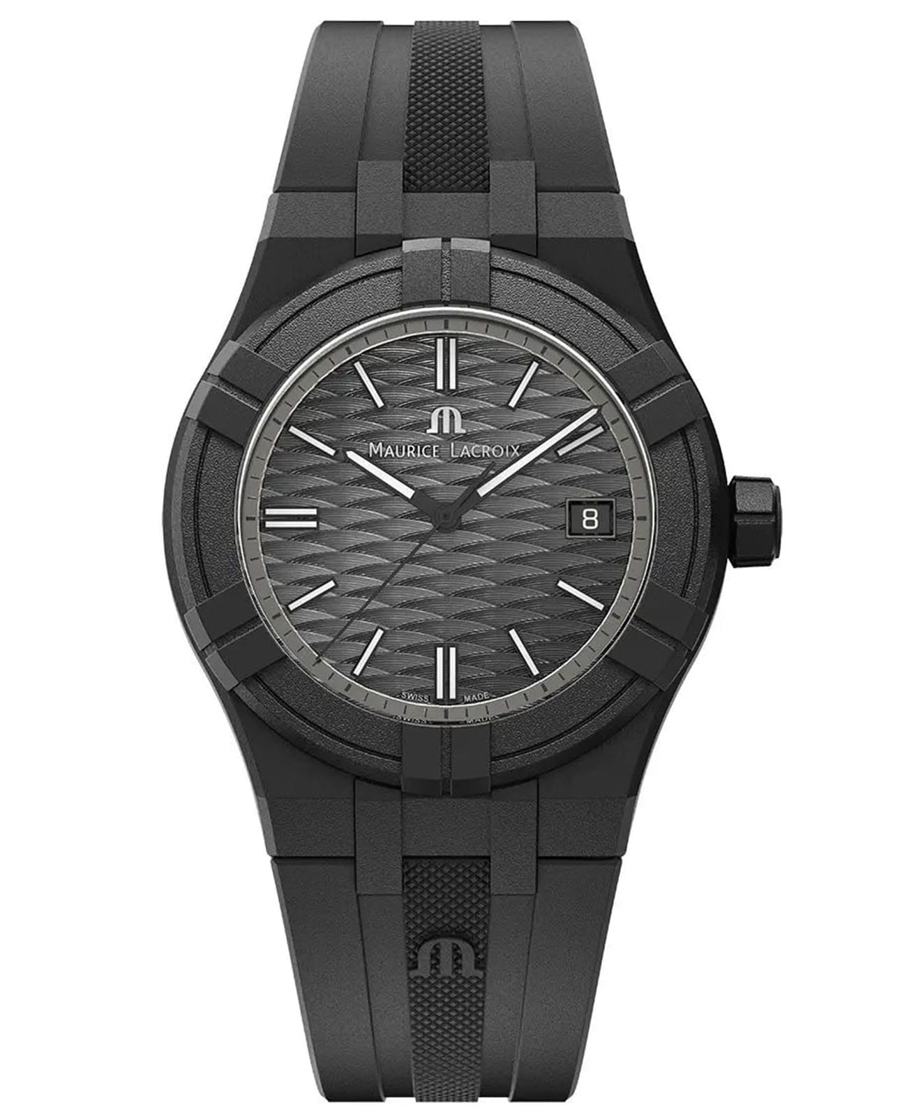 Мужские швейцарские кварцевые часы Maurice Lacroix Aikon Quartz AI2008-00000-300-0. Сапфировое стеклоСапфировое стеклоПрочный и надёжный материал из кристалла сапфира синтетического происхождения, характеризующийся особой твёрдостью и устойчивостью к царапинам и повреждениям. устойчивое к появлению царапин, обладающее высокой прозрачностью. Зеленый циферблат. Стрелки и метки с люминесцентным покрытиемЛюминесцентное покрытиеПозволяет считывать показания времени в темноте. Производители наносят на стрелки, часовые индексы, безель или поверхность циферблата светонакопительный состав, дающий холодное свечение.. Класс водозащиты: 100 метров, позволит плавать, нырять и заниматься другими водными видами спорта. Окошко даты находится в положении 3 часов. Циферблат черного цвета с тематическим гильошированием "Vagues du Jura". Корпус выполнен из переработанного пластика, ранее загрязнявшего Мировой океан. Каучуковый ремешок с классической застежкой.
