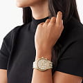 Женские американские часы-хронографХронографФункция позволяет измерять отрезки времени с особой точностью: часы, минуты, секунды. Верным признаком хронографа является наличие на циферблате 3 дополнительных окошек-счётчиков. с секундомеромСекундомерСекундоме́р — прибор, способный измерять интервалы времени с точностью до долей секунды. и с минеральным стекломМинеральное стеклоМинеральное стекло представляет собой искусственно выращенный минерал кварца. Такое стекло отличается особой устойчивостью к повреждениям и царапинам. Уступает по некоторым качествам сапфировому стеклу. Michael Kors Ritz MK6747, кварцевый механизм с высокой точностью. Корпус и браслет часов изготовлены из стали с PVD-покрытиемPVDУльтратонкое покрытие наносится в технике вакуумного напыления, сочетает в себе нитрид титана особой прочности со слоем золота или оксида хрома. Несёт в себе декоративную или защитную функцию.. БезельБезельВнешний ободок, закрепляющий стекло. В спортивных часах так называется поворотное кольцо с делениями на циферблате, выполняет роль таймера – замеряет отрезки времени на шкале. Неподвижный безель – элемент декора. Однонаправленно вращающийся безель на дайверских часах позволяет фиксировать моменты погружения и выныривания на поверхность., ремень и циферблат украшены кристаллами. Три дополнительных индикатора на циферблате. Метки в виде штрихов. Окошко даты находится между 4 и 5 часами. Класс водозащиты: 50 метров, позволит защитить корпус от случайных брызг или капель дождя. Стальной браслет на раскладной застёжкеРаскладная застёжкаТакой тип застёжки используется только на браслетах из металла. Она никогда не раскрывается полностью, происходит разделение на 2 и более частей. Раскладывающая застёжка снизит вероятность потери часов к минимуму..