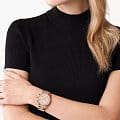 Женские американские часы-хронографХронографФункция позволяет измерять отрезки времени с особой точностью: часы, минуты, секунды. Верным признаком хронографа является наличие на циферблате 3 дополнительных окошек-счётчиков. с секундомеромСекундомерСекундоме́р — прибор, способный измерять интервалы времени с точностью до долей секунды. и с минеральным стекломМинеральное стеклоМинеральное стекло представляет собой искусственно выращенный минерал кварца. Такое стекло отличается особой устойчивостью к повреждениям и царапинам. Уступает по некоторым качествам сапфировому стеклу. Michael Kors Ritz MK7242, кварцевый механизм с высокой точностью. Корпус и браслет часов изготовлены из стали с PVD-покрытиемPVDУльтратонкое покрытие наносится в технике вакуумного напыления, сочетает в себе нитрид титана особой прочности со слоем золота или оксида хрома. Несёт в себе декоративную или защитную функцию.. БезельБезельВнешний ободок, закрепляющий стекло. В спортивных часах так называется поворотное кольцо с делениями на циферблате, выполняет роль таймера – замеряет отрезки времени на шкале. Неподвижный безель – элемент декора. Однонаправленно вращающийся безель на дайверских часах позволяет фиксировать моменты погружения и выныривания на поверхность. украшен кристаллами. Три дополнительных индикатора на циферблате. Метки в виде штрихов. Окошко даты находится в положении 6 часов. Класс водозащиты: 100 метров, позволит плавать, нырять и заниматься другими водными видами спорта. Стальной браслет на раскладной застёжкеРаскладная застёжкаТакой тип застёжки используется только на браслетах из металла. Она никогда не раскрывается полностью, происходит разделение на 2 и более частей. Раскладывающая застёжка снизит вероятность потери часов к минимуму..