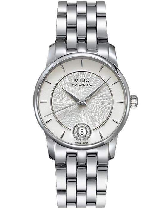 Женские швейцарские механические часы Mido Baroncelli Diamonds M007.207.11.036.00. Механический механизм (автоматический калибр) с высокой точностью. Сапфировое стеклоСапфировое стеклоПрочный и надёжный материал из кристалла сапфира синтетического происхождения, характеризующийся особой твёрдостью и устойчивостью к царапинам и повреждениям. с антибликовым покрытиемАнтибликовое покрытиеСлой оксида металла в 0,13-0,3 микрон, благодаря которому стекло часов не бликует и не отражает свет. Антибликовое покрытие уменьшает отражение света в 10 раз, обеспечивая отличную читаемость показателей циферблата. устойчивое к появлению царапин, обладающее высокой прозрачностью. Корпус выполнен из стали. Прозрачная задняя крышка. Класс водозащиты: 50 метров, позволит защитить корпус от случайных брызг или капель дождя. Стальной браслет на раскладной застёжкеРаскладная застёжкаТакой тип застёжки используется только на браслетах из металла. Она никогда не раскрывается полностью, происходит разделение на 2 и более частей. Раскладывающая застёжка снизит вероятность потери часов к минимуму.. На циферблате 12 бриллиантов общим весом 0,03 карата, окантовывающих окошко даты. Гильошированный циферблат.