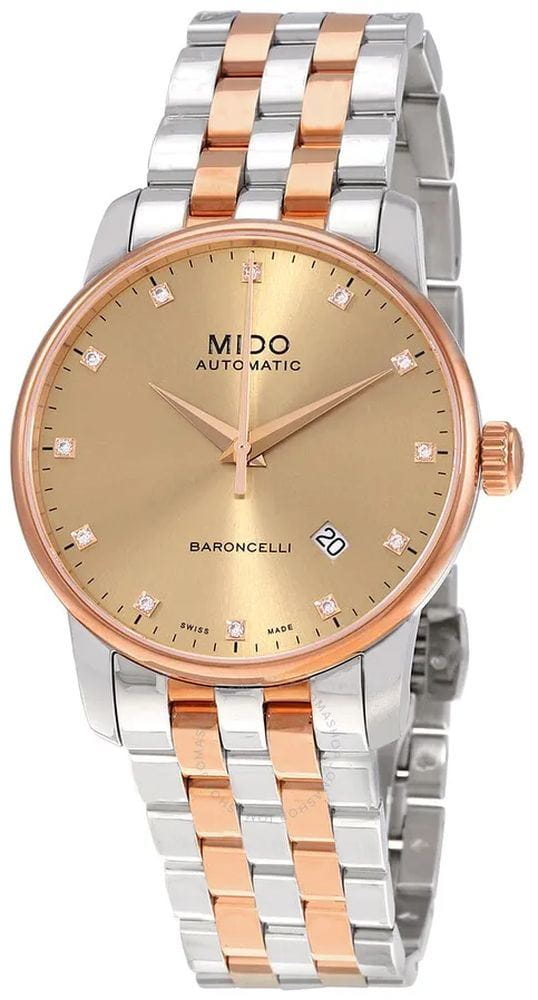 Mido Baroncelli M8600.4.26.1 — элегантная модель, сочетающая классику и современную швейцарскую инженерию. Корпус диаметром 38 мм изготовлен из нержавеющей стали и дополнен браслетом с PVD-покрытиемPVDУльтратонкое покрытие наносится в технике вакуумного напыления, сочетает в себе нитрид титана особой прочности со слоем золота или оксида хрома. Несёт в себе декоративную или защитную функцию. в пять рядов, снабжённым раскладной застёжкойРаскладная застёжкаТакой тип застёжки используется только на браслетах из металла. Она никогда не раскрывается полностью, происходит разделение на 2 и более частей. Раскладывающая застёжка снизит вероятность потери часов к минимуму. для удобства и надежности фиксации. БезельБезельВнешний ободок, закрепляющий стекло. В спортивных часах так называется поворотное кольцо с делениями на циферблате, выполняет роль таймера – замеряет отрезки времени на шкале. Неподвижный безель – элемент декора. Однонаправленно вращающийся безель на дайверских часах позволяет фиксировать моменты погружения и выныривания на поверхность. с PVD-покрытиемPVDУльтратонкое покрытие наносится в технике вакуумного напыления, сочетает в себе нитрид титана особой прочности со слоем золота или оксида хрома. Несёт в себе декоративную или защитную функцию.. Циферблат декорирован двенадцатью бриллиантами в качестве часовых меток, что придаёт часам утончённость и ювелирный блеск.