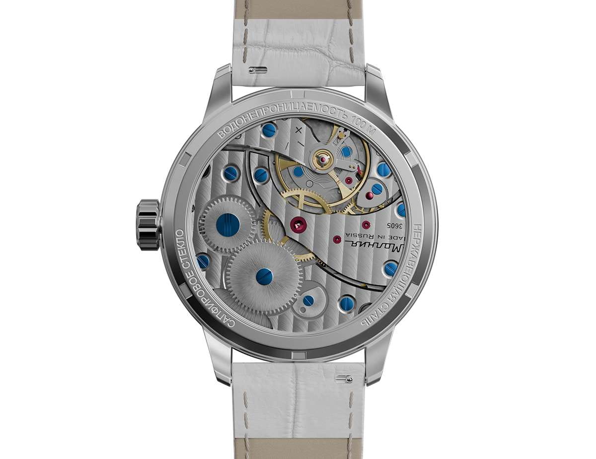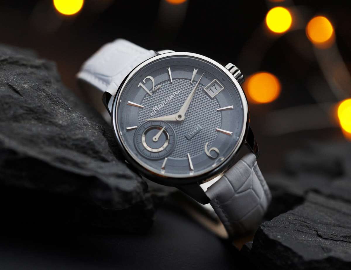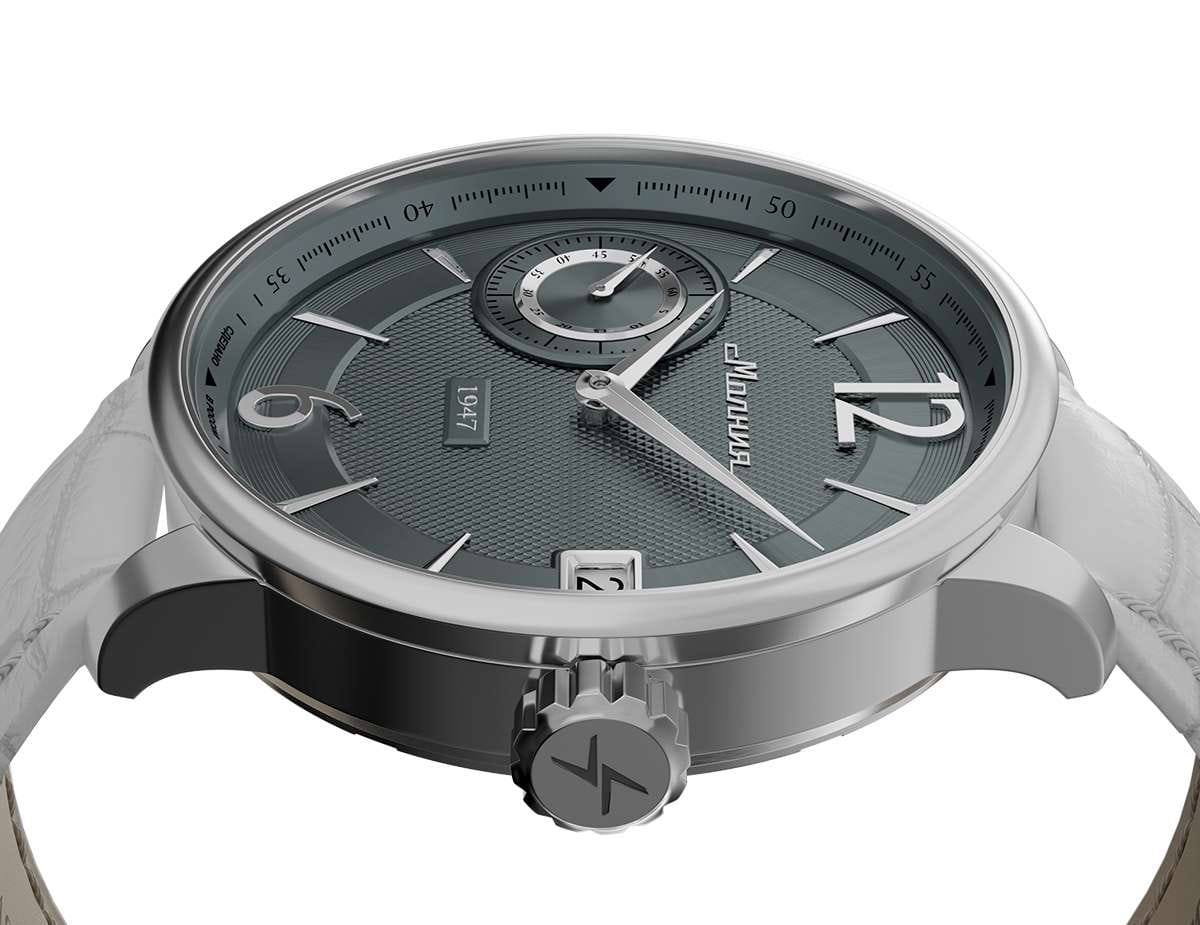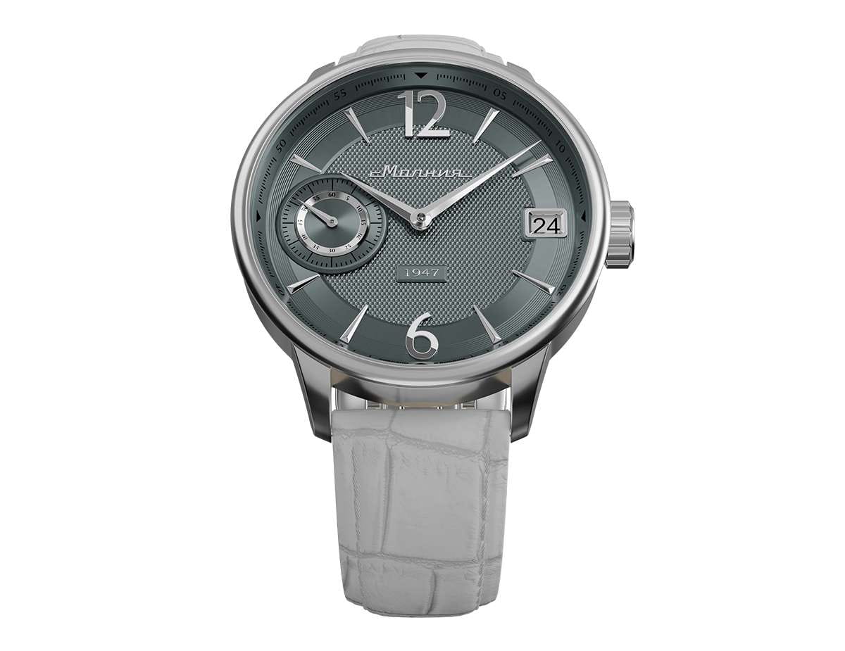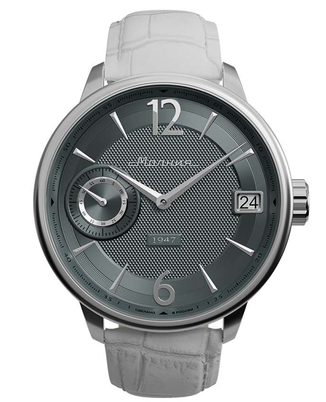 Мужские механические часы с ручным подзаводом — это аксессуар от легендарного бренда «МОЛНИЯ», созданный на Челябинском часовом заводе. Корпус диаметром 41 мм выполнен из нержавеющей стали 316L с зеркальной полировкой. Циферблат серого цвета оформлен арабскими цифрами и стальными индексами. Малая секундная стрелка вынесена на позицию 9 часов, окошко даты расположено в положении 3 часов. Циферблат защищён сапфировым стекломСапфировое стеклоПрочный и надёжный материал из кристалла сапфира синтетического происхождения, характеризующийся особой твёрдостью и устойчивостью к царапинам и повреждениям.. Механизм — мануфактурный калибр 3605, собранный вручную, с запасом хода до 40 часов. Прозрачная задняя крышка позволяет наблюдать за работой механизма. Часы оснащены кожаным ремешком белого цвета с раскладной застёжкойРаскладная застёжкаТакой тип застёжки используется только на браслетах из металла. Она никогда не раскрывается полностью, происходит разделение на 2 и более частей. Раскладывающая застёжка снизит вероятность потери часов к минимуму. и системой быстрой замены. Водонепроницаемость 100 м позволяет использовать часы для плавания и повседневного ношения. Идеальный выбор для тех, кто ценит российское качество и традиции.
