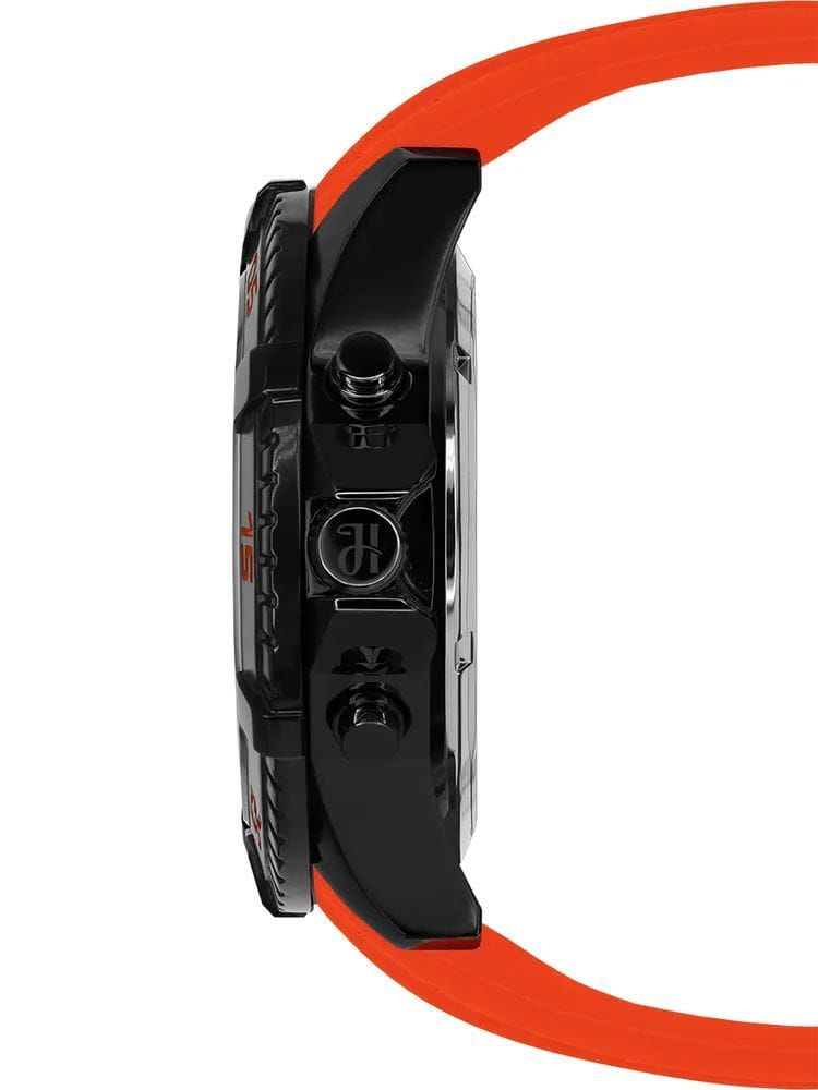 Ремешок выполнен из прочного силикона, обеспечивая комфорт при носке и добавляя модели спортивный характер. Толщина корпуса составляет 17 мм, что придаёт часам солидный вид.