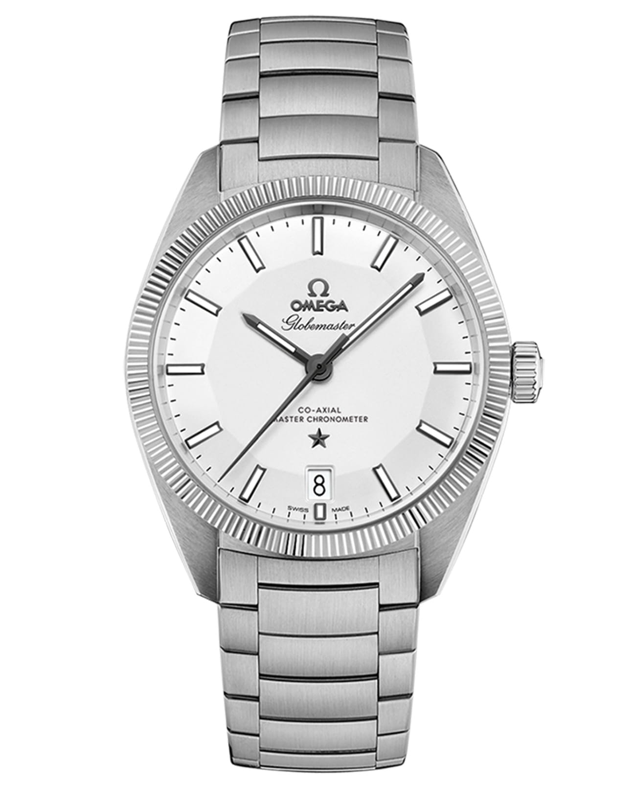 Часы Globemaster – воплощение часового совершенства OMEGA, где традиции встречаются с передовыми технологиями. Как первенец среди мастер-хронометров, они устанавливают новые стандарты точности и надежности. Эти часы приковывают внимание ценителей не только безупречным качеством, но и сдержанной элегантностью дизайна. Корпус из нержавеющей стали гармонично сочетается с рифленым безелемБезельВнешний ободок, закрепляющий стекло. В спортивных часах так называется поворотное кольцо с делениями на циферблате, выполняет роль таймера – замеряет отрезки времени на шкале. Неподвижный безель – элемент декора. Однонаправленно вращающийся безель на дайверских часах позволяет фиксировать моменты погружения и выныривания на поверхность. из сверхпрочного металла, а циферблат украшают черненая звезда, стрелки и индексы с люминесцентным покрытиемЛюминесцентное покрытиеПозволяет считывать показания времени в темноте. Производители наносят на стрелки, часовые индексы, безель или поверхность циферблата светонакопительный состав, дающий холодное свечение., оживающие в темноте подобно звездам на ночном небе. Особый шарм модели придает медальон Женевской обсерватории на задней крышке и серебристый опаловый циферблат "Pie Pan", чьи изгибы повторяют формы легендарной модели 1952 года. Облик завершает трехрядный браслет из нержавеющей стали с изящно изогнутыми центральными звеньями, а сердцем этих часов служит коаксиальный хронометр OMEGA Master Chronometer 8900 с революционной защитой от магнитных полей.