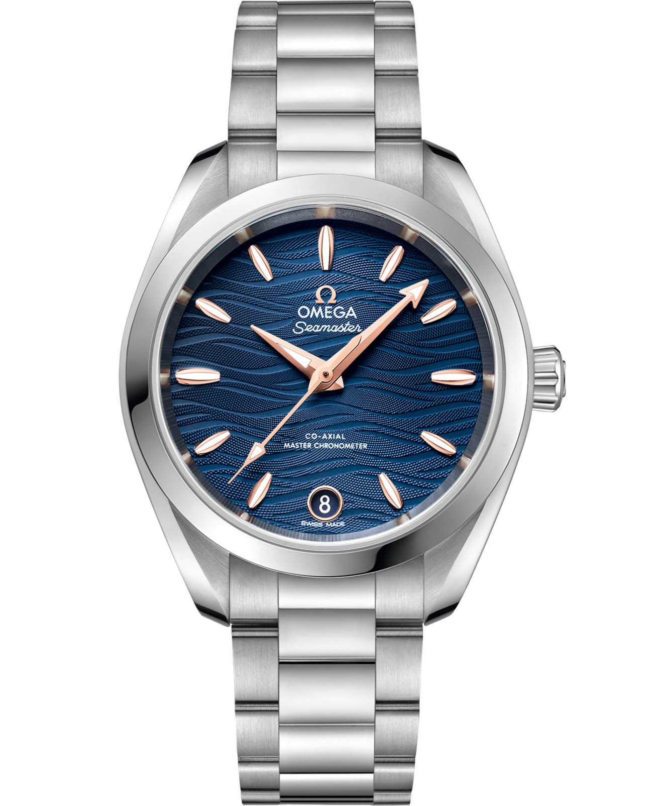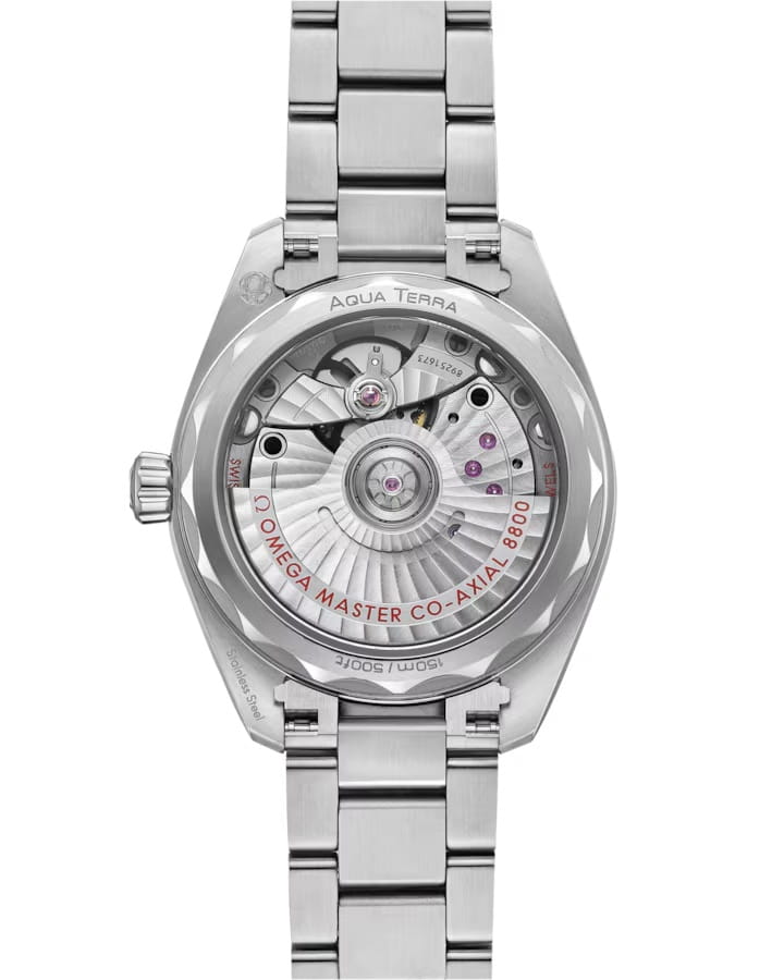 Omega Seamaster Aqua Terra выполнены в симметричном корпусе из нержавеющей стали с завинчивающейся задней крышкой, украшенной волновым узором. Циферблат дополнен окошком даты на 6 часах и оформлен в виде волнообразного рисунка, вдохновлённого морским наследием коллекции. Стрелки и метки выполнены из 18K Sedna™ золота и оснащены люминесцентным покрытиемЛюминесцентное покрытиеПозволяет считывать показания времени в темноте. Производители наносят на стрелки, часовые индексы, безель или поверхность циферблата светонакопительный состав, дающий холодное свечение. Super-LumiNova для лучшей читаемости в темноте. Индексы выполнены в форме корпусов парусников — деталь, подчёркивающая морское наследие модели. Калибр Omega 8800 сертифицирован как Master Chronometer — гарантия высочайшей точности и устойчивости к магнитным полям. Запас хода составляет 55 часов. Защиту циферблата обеспечивает сапфировое стеклоСапфировое стеклоПрочный и надёжный материал из кристалла сапфира синтетического происхождения, характеризующийся особой твёрдостью и устойчивостью к царапинам и повреждениям. с антибликовым покрытиемАнтибликовое покрытиеСлой оксида металла в 0,13-0,3 микрон, благодаря которому стекло часов не бликует и не отражает свет. Антибликовое покрытие уменьшает отражение света в 10 раз, обеспечивая отличную читаемость показателей циферблата. с обеих сторон. Водозащита позволяет использовать часы в воде без риска повреждения. Часы установлены на интегрированный стальной браслет. Это сочетание премиального качества, технологичности и классического дизайна.