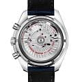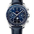Speedmaster Moonphase воплощает космическое наследие OMEGA, представив уникальную модель с двумя невероятно детализированными изображениями Луны. 44,25-мм корпус из нержавеющей стали с синим керамическим безелемБезельВнешний ободок, закрепляющий стекло. В спортивных часах так называется поворотное кольцо с делениями на циферблате, выполняет роль таймера – замеряет отрезки времени на шкале. Неподвижный безель – элемент декора. Однонаправленно вращающийся безель на дайверских часах позволяет фиксировать моменты погружения и выныривания на поверхность., украшенным тахиметрической шкалойТахиметрРазмеченная шкала, располагается на ободке или безеле часов. Тахиметр позволяет рассчитать скорость на определённом участке пути, расстояние измеряется в километрах или милях. из Liquidmetal™, сочетается с синим кожаным ремешком и полированной застежкой. Синий циферблат с радиальным сатинированием и индексами с родиевым покрытием дополнен уникальным указателем фаз Луны на "6 часах", где лунный диск из металлизированного хрусталя с микроструктурой поражает реалистичностью. Прецизионный механизм OMEGA Co-Axial Master Chronometer 9904 с сертификатом METAS продолжает традиции космической точности.