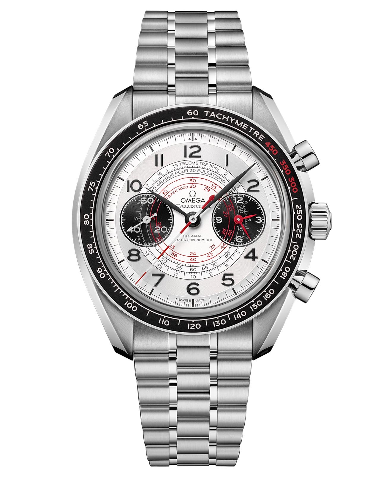 Chronoscope искусно переосмысливает наследие OMEGA, соединяя винтажную эстетику 1940-х с культовым стилем Speedmaster. 43-мм корпус из нержавеющей стали с черным безелемБезельВнешний ободок, закрепляющий стекло. В спортивных часах так называется поворотное кольцо с делениями на циферблате, выполняет роль таймера – замеряет отрезки времени на шкале. Неподвижный безель – элемент декора. Однонаправленно вращающийся безель на дайверских часах позволяет фиксировать моменты погружения и выныривания на поверхность. из анодированного алюминия обрамляет серебристый циферблат с контрастными чернеными элементами. Уникальный спиралевидный узор подчеркивает три исторические шкалы в форме улитки: тахиметрическуюТахиметрРазмеченная шкала, располагается на ободке или безеле часов. Тахиметр позволяет рассчитать скорость на определённом участке пути, расстояние измеряется в километрах или милях., пульсометрическую и телеметрическую. Черненые стрелки в форме листьев и арабские цифры создают элегантный монохромный образ. На позиции "9 часов" расположен счетчик малых секунд, а на "3 часах" - "60-минутный и 12-часовой счетчики" с эффектными красными стрелками. Браслет из нержавеющей стали завершает композицию, а калибр OMEGA Co-Axial Master Chronometer 9908 обеспечивает безупречную точность, соединяя традиции с современными технологиями.