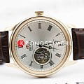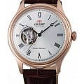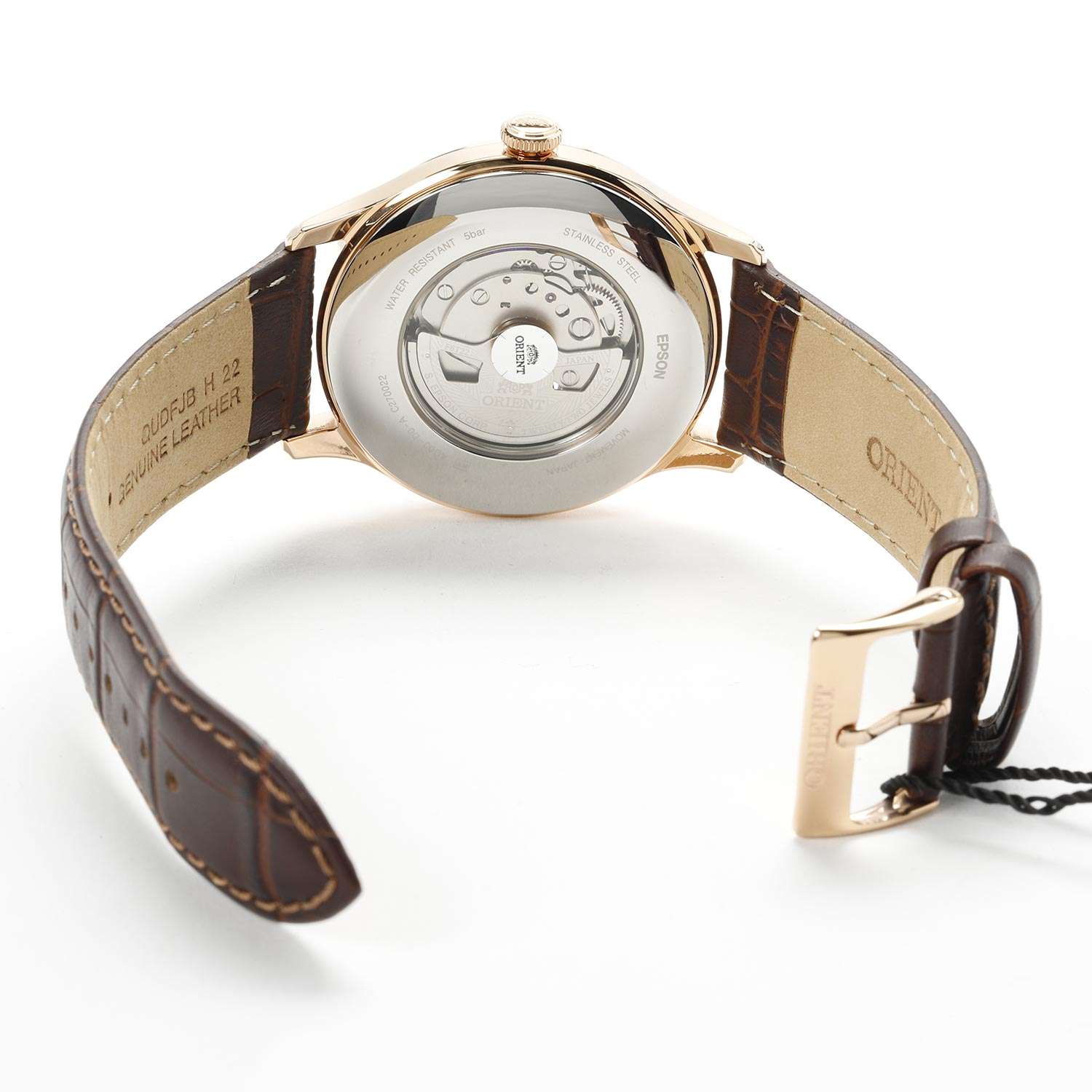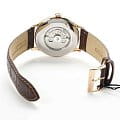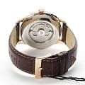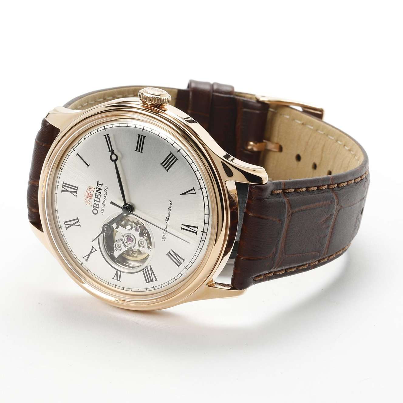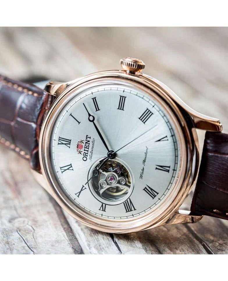 Orient Classic Open Heart AG00001S — это элегантные классические часы с утонченным дизайном и надежным механизмом. Корпус диаметром 43 мм выполнен из нержавеющей стали с PVD-покрытиемPVDУльтратонкое покрытие наносится в технике вакуумного напыления, сочетает в себе нитрид титана особой прочности со слоем золота или оксида хрома. Несёт в себе декоративную или защитную функцию. розового цвета, что придает модели изысканный и благородный вид. Циферблат шампанского оттенка украшен римскими цифрами и черными стрелками, обеспечивая четкость отображения времени. Окошко "Open Heart" на отметке 9 часов позволяет наблюдать за работой механизма. Защиту циферблата обеспечивает минеральное стеклоМинеральное стеклоМинеральное стекло представляет собой искусственно выращенный минерал кварца. Такое стекло отличается особой устойчивостью к повреждениям и царапинам. Уступает по некоторым качествам сапфировому стеклу. с выпуклой формой. Внутри установлен автоматический механизм Orient калибра F6T22 с возможностью ручного подзавода и функцией стоп-секунды, обеспечивающий точность и запас хода до 40 часов. Модель комплектуется коричневым кожаным ремешком с тиснением под крокодила, а классическая застёжка обеспечивает комфортное и надежное ношение. Водонепроницаемость 50 метров защищает часы от брызг и кратковременного контакта с водой, делая их идеальным выбором для повседневного использования.