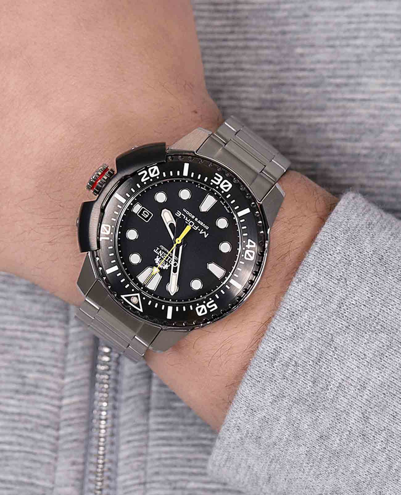 Мужские механические часы с автоподзаводом Orient M-Force RA-AC0L01B представляют собой идеальное сочетание стиля, функциональности и надежности. Эти часы созданы специально для любителей активного отдыха и водных видов спорта. Корпус и браслет часов изготовлены из высококачественной нержавеющей стали, которая обладает повышенной стойкостью к механическим повреждениям и коррозии. Циферблат защищен сапфировым стекломСапфировое стеклоПрочный и надёжный материал из кристалла сапфира синтетического происхождения, характеризующийся особой твёрдостью и устойчивостью к царапинам и повреждениям., известным своей исключительной прочностью и высокой прозрачностью. Это стекло имеет специальное антибликовое покрытие, благодаря чему циферблат остается четким и легко читаемым даже при ярком солнечном свете. БезельБезельВнешний ободок, закрепляющий стекло. В спортивных часах так называется поворотное кольцо с делениями на циферблате, выполняет роль таймера – замеряет отрезки времени на шкале. Неподвижный безель – элемент декора. Однонаправленно вращающийся безель на дайверских часах позволяет фиксировать моменты погружения и выныривания на поверхность. часов выполнен с использованием IP-покрытияIP-покрытиеМетод ионного напыления. Демонстрирует повышенную устойчивость к истиранию, окислению и химическим веществам. Под воздействием высокого давления и температуры около 1500°C молекулы металла надёжно соединяются с частицами корпуса часов., что значительно увеличивает его износостойкость и защищает от царапин. Он плавно вращается в одном направлении, обеспечивая точность измерения времени погружения.На циферблате расположено окошко дня недели и даты, находящееся в положении 3 часа. Этот элемент придает часам дополнительную функциональность и удобство в использовании. Механизм часов оснащен 22 камнями, что обеспечивает высокую точность работы и долговечность устройства. Частота колебаний механизма составляет 21600 полуколебаний в час, а запас хода достигает 40 часов, что позволяет часам работать без необходимости ежедневного завода. Для обеспечения отличной видимости в темное время суток стрелки и метки покрыты люминесцентным покрытиемЛюминесцентное покрытиеПозволяет считывать показания времени в темноте. Производители наносят на стрелки, часовые индексы, безель или поверхность циферблата светонакопительный состав, дающий холодное свечение., которое светится в темноте, облегчая считывание показаний. Класс водонепроницаемости этих часов составляет 200 метров, что делает их подходящими для плавания, дайвинга и других водных видов спорта. Браслет часов изготовлен из нержавеющей стали и оснащен раскладной застежкойРаскладная застёжкаТакой тип застёжки используется только на браслетах из металла. Она никогда не раскрывается полностью, происходит разделение на 2 и более частей. Раскладывающая застёжка снизит вероятность потери часов к минимуму., которая обеспечивает надежную фиксацию на запястье и удобство использования. Эта модель часов станет надежным спутником в любых приключениях и подчеркнет ваш стиль и любовь к активным видам отдыха.