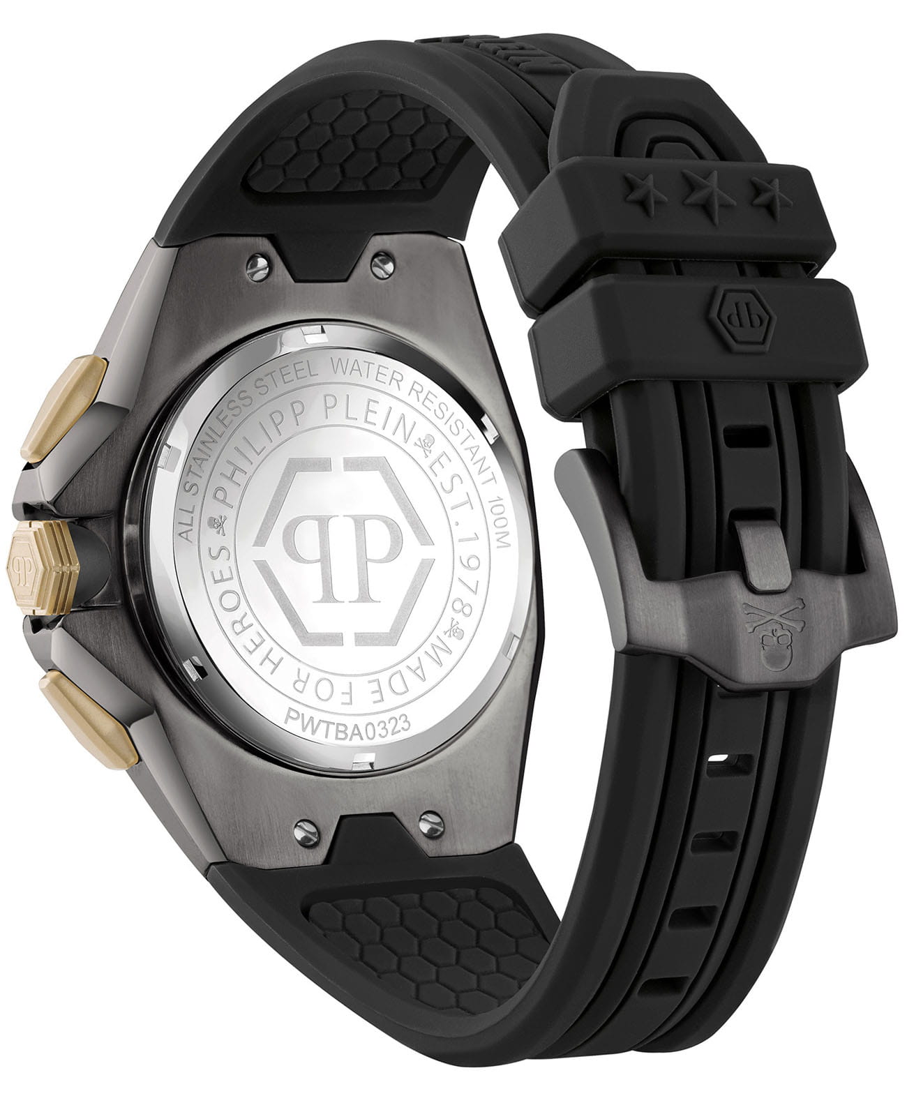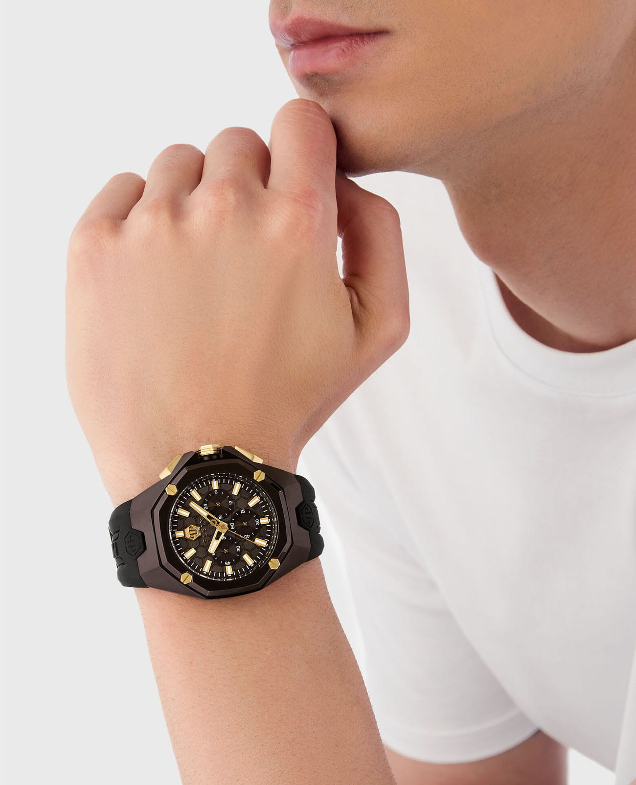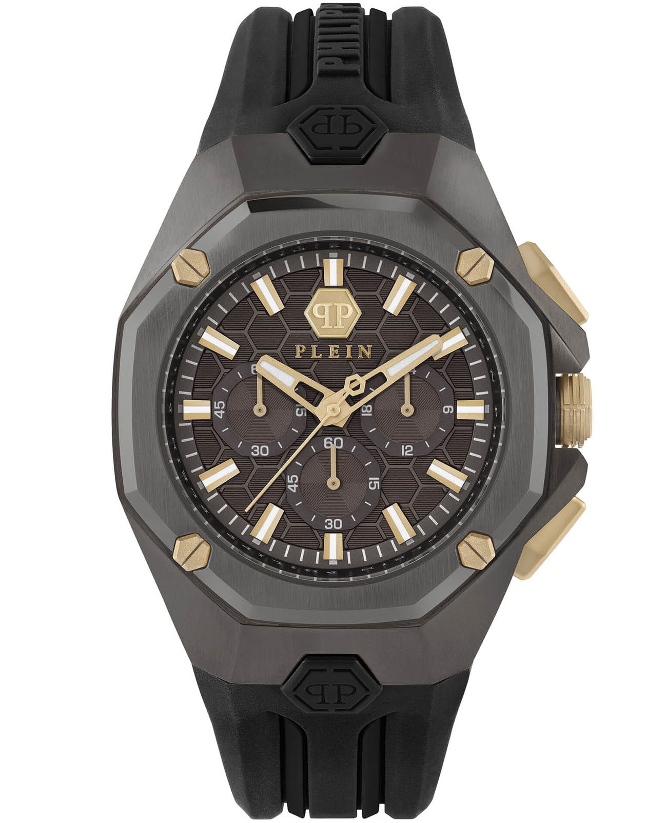 Мужские часы c хронографомХронографФункция позволяет измерять отрезки времени с особой точностью: часы, минуты, секунды. Верным признаком хронографа является наличие на циферблате 3 дополнительных окошек-счётчиков. Philipp Plein Octagon PWTBA0323, кварцевый механизм с высокой точностью. Класс водозащиты: 50 метров, позволит защитить корпус от случайных брызг или капель дождя. Корпус часов изготовлен из нержавеющей стали с IP-покрытиемIP-покрытиеМетод ионного напыления. Демонстрирует повышенную устойчивость к истиранию, окислению и химическим веществам. Под воздействием высокого давления и температуры около 1500°C молекулы металла надёжно соединяются с частицами корпуса часов.. Стрелки и метки с люминесцентным покрытиемЛюминесцентное покрытиеПозволяет считывать показания времени в темноте. Производители наносят на стрелки, часовые индексы, безель или поверхность циферблата светонакопительный состав, дающий холодное свечение.. 12 и 24-часовой формат времени. Минеральное стеклоМинеральное стеклоМинеральное стекло представляет собой искусственно выращенный минерал кварца. Такое стекло отличается особой устойчивостью к повреждениям и царапинам. Уступает по некоторым качествам сапфировому стеклу. устойчивое к мелким механическим повреждениям.