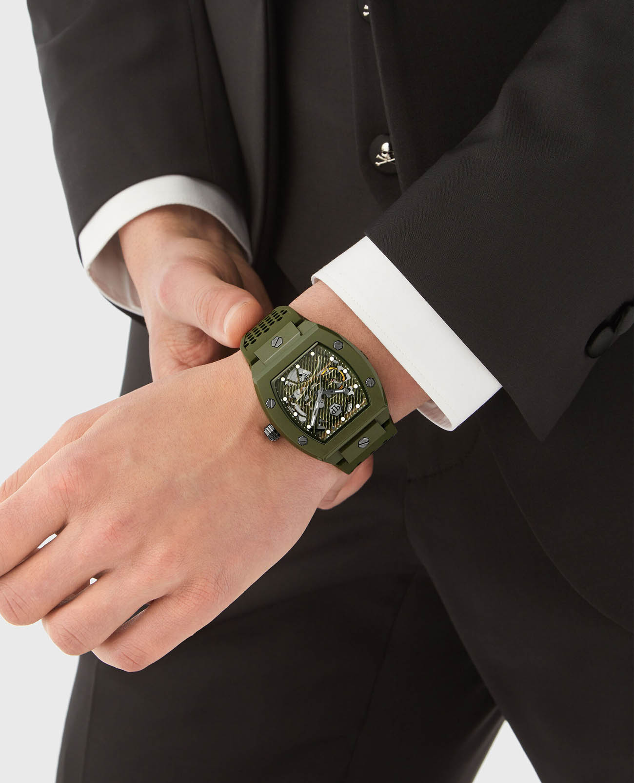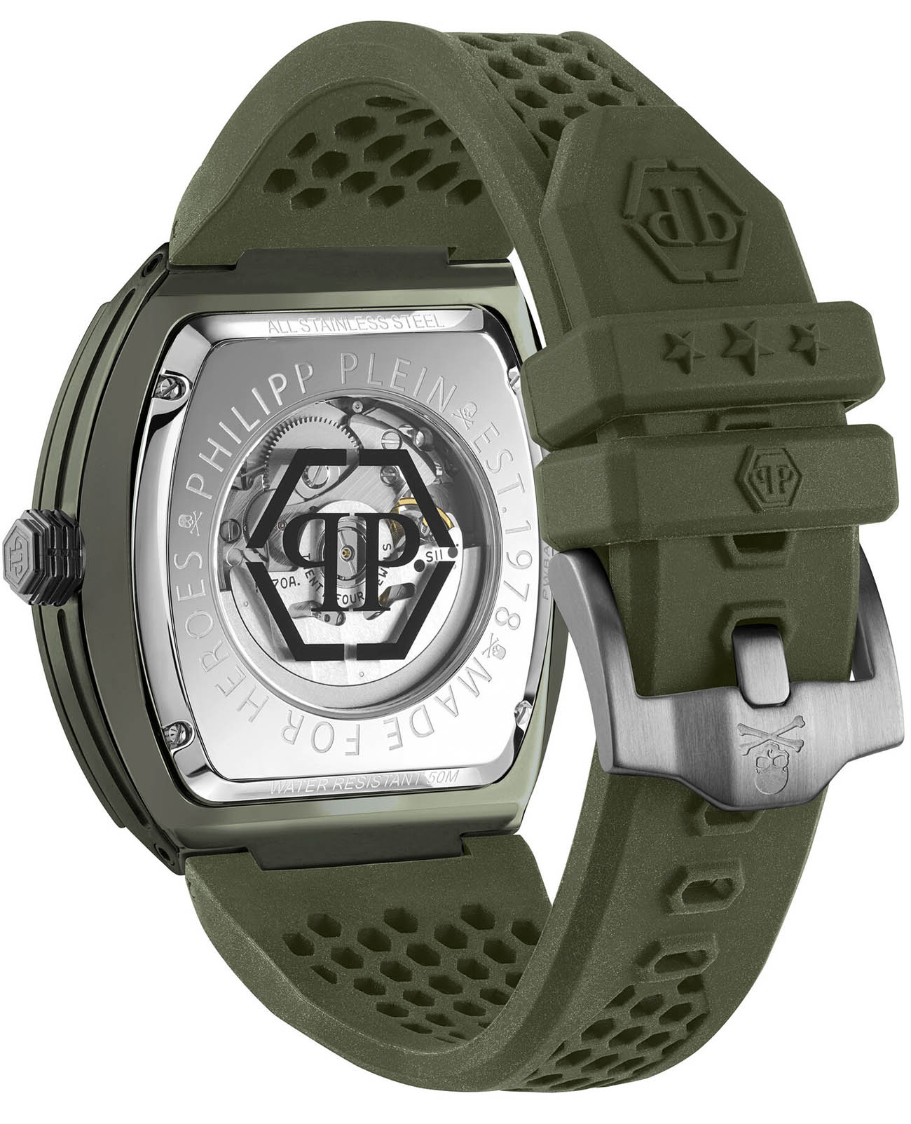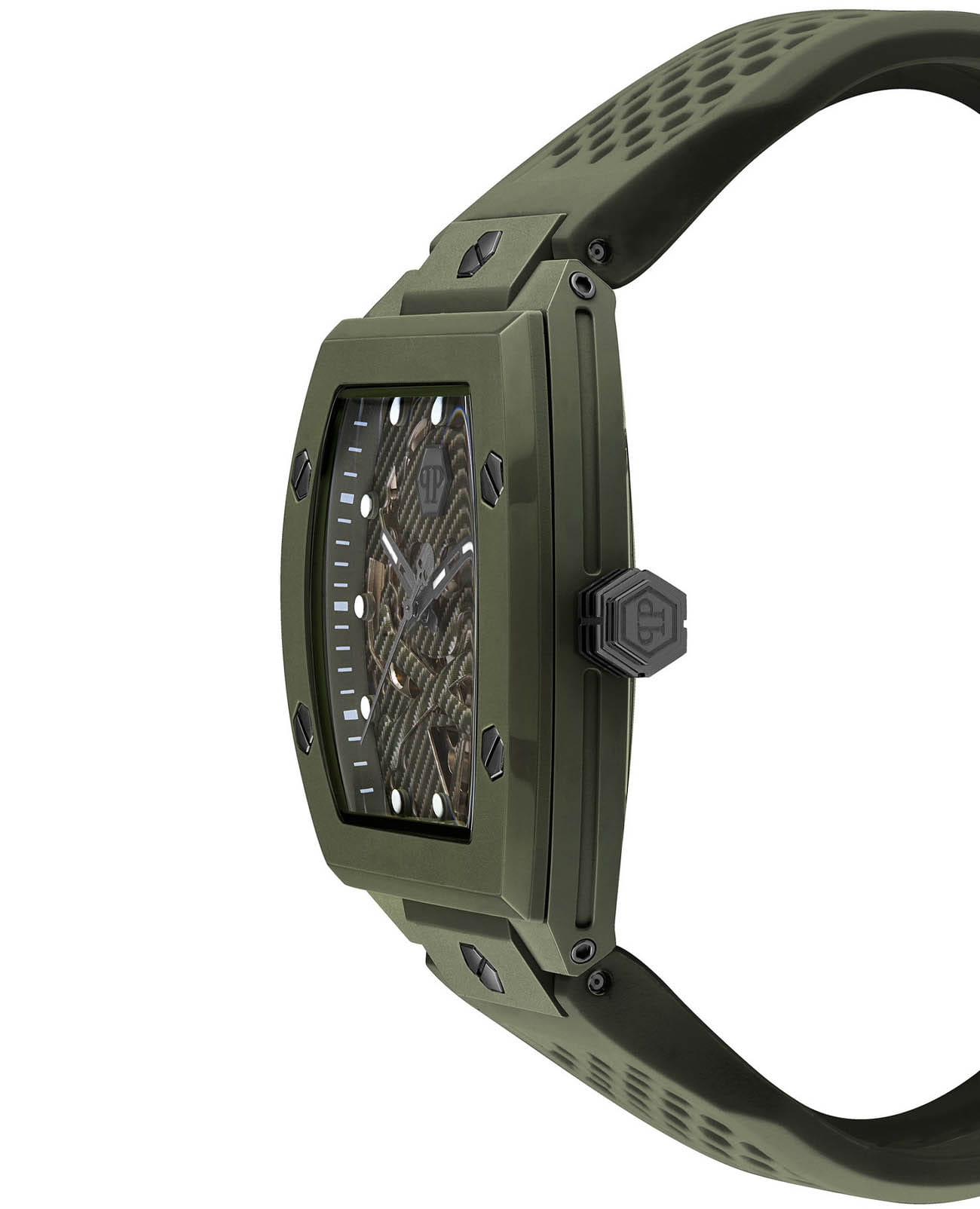 Мужские механические часы-скелетоны Philipp Plein The Skeleton PWVBA0223. Корпус часов изготовлен из экокерамики. Минеральное стеклоМинеральное стеклоМинеральное стекло представляет собой искусственно выращенный минерал кварца. Такое стекло отличается особой устойчивостью к повреждениям и царапинам. Уступает по некоторым качествам сапфировому стеклу. устойчивое к мелким механическим повреждениям. Влагозащита: 50 метров, позволит защитить корпус от случайных брызг или капель дождя. Стрелки и метки с люминесцентным покрытиемЛюминесцентное покрытиеПозволяет считывать показания времени в темноте. Производители наносят на стрелки, часовые индексы, безель или поверхность циферблата светонакопительный состав, дающий холодное свечение.. Практичный ремешок из силикона на стандартной застёжке.